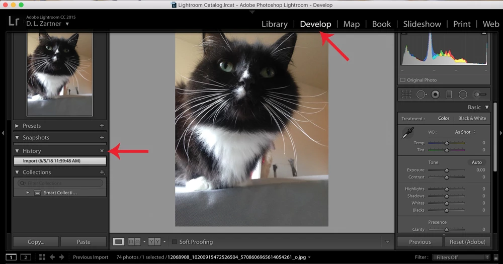 where can i see my edit history in lightroom cc? i added a preset to an image a month ago and i cant remember which one it was and i want to see it. how can i do that?
