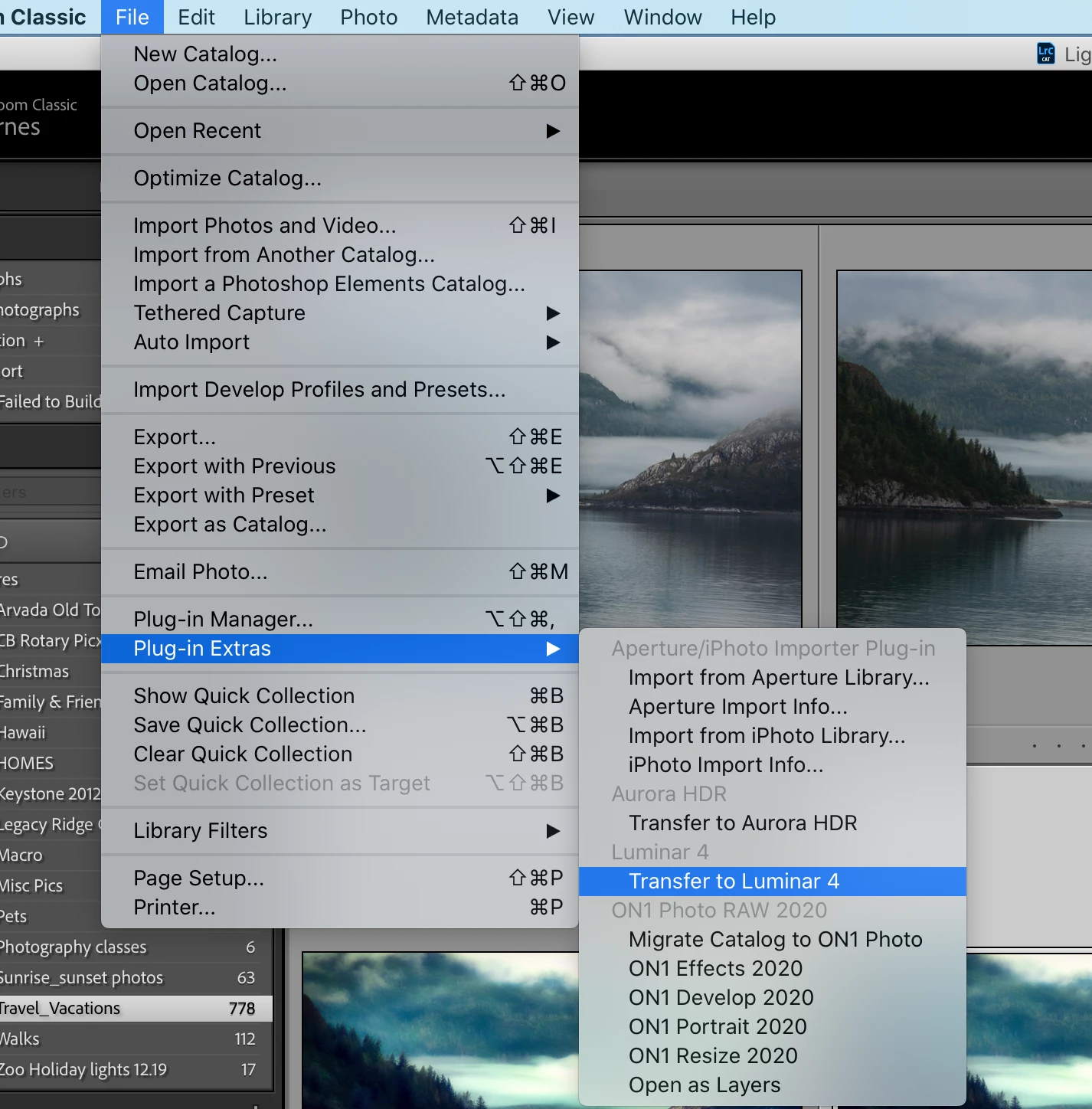 I'm a new user of LR Classic and it's been great. Please bear with me: I'm having an issue with the Luminar 4 plug in. Luminar makes creating a plug in easy by recognizing PS, LR. At first it showed up in "Edit In" menu with no problems. Right where it should be. However, after installing Photoshop, Luminar 4 was there but now sends my image to the full Luminar app, with it's catalogs, etc.,This is not the Luminar plug in screen with "Apply". The plug in does shows up in "Plug in extras' though and works fine. (note, my other plugins work fine in the Edit In menu This happend after I installed PS. Any idea how to get the Luminar plug in to work in the Edit In menu and not just in the Plug in Extras menu as my others do? Hope I'm being clear. See the two screenshots. Thanks in advance!