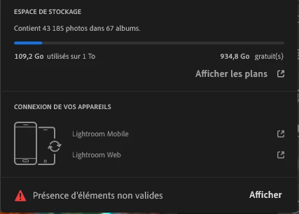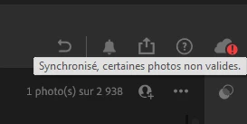 J'ai un message d'erreur de Lr (Cloud based) sous Windows qui se synchronise mais signale des photos non-valides (voir capture).