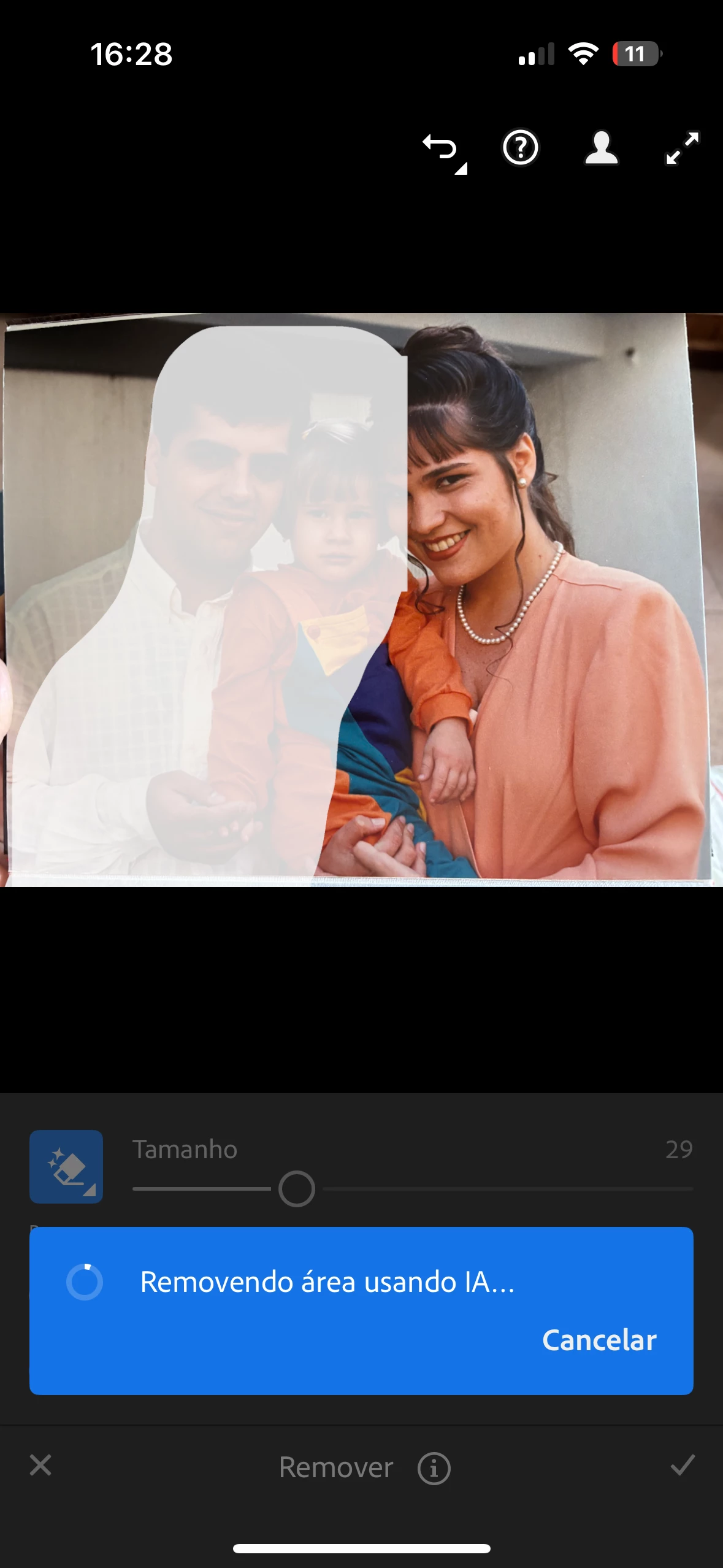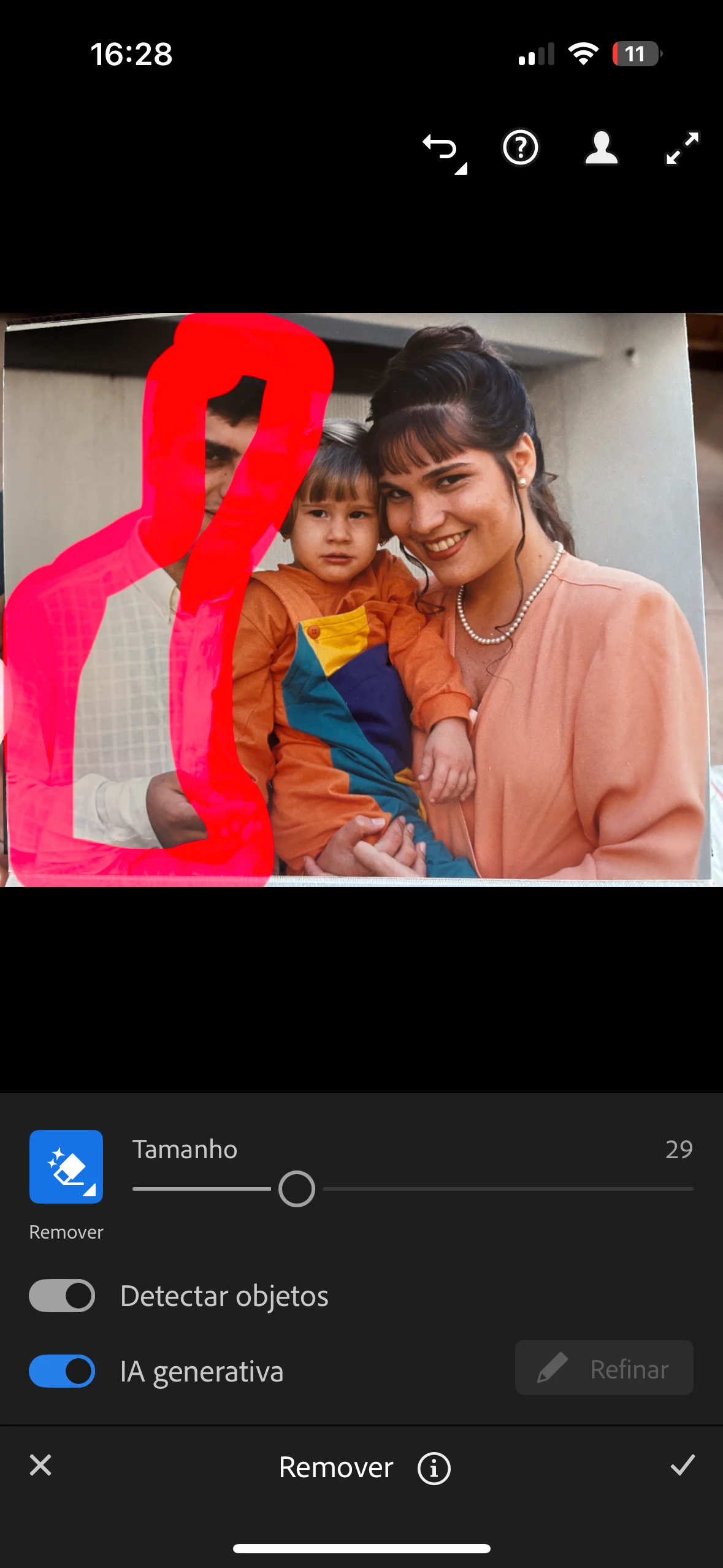 Estou tentando remover uma pessoa da foto, faço a seleção dela, mas não tirar o dedo da tela, automaticamente é selecionado uma área maior que eu desejo, antes eu utilizei diversas vezes essa função e funcionou normalmente, agora está dando esse erro. Na área vermelha é a que eu selecionei, e a branca é o erro que está acontecendo.