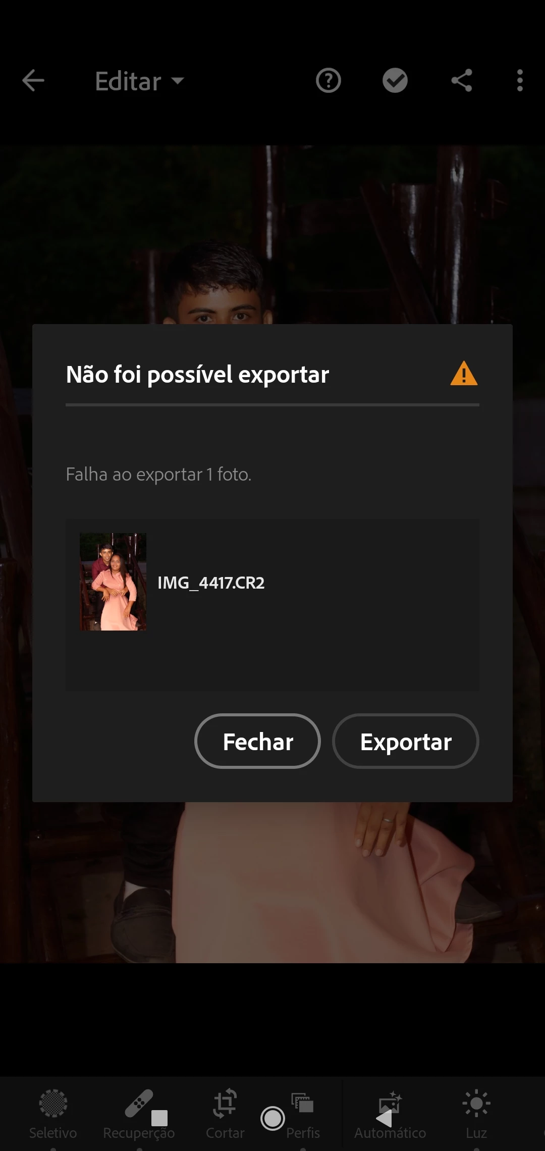Não consigo exportar nenhuma das minhas fotos e salvar no meu dispositivo móvel. Como resolver esse problema? Por favor, me ajudem!