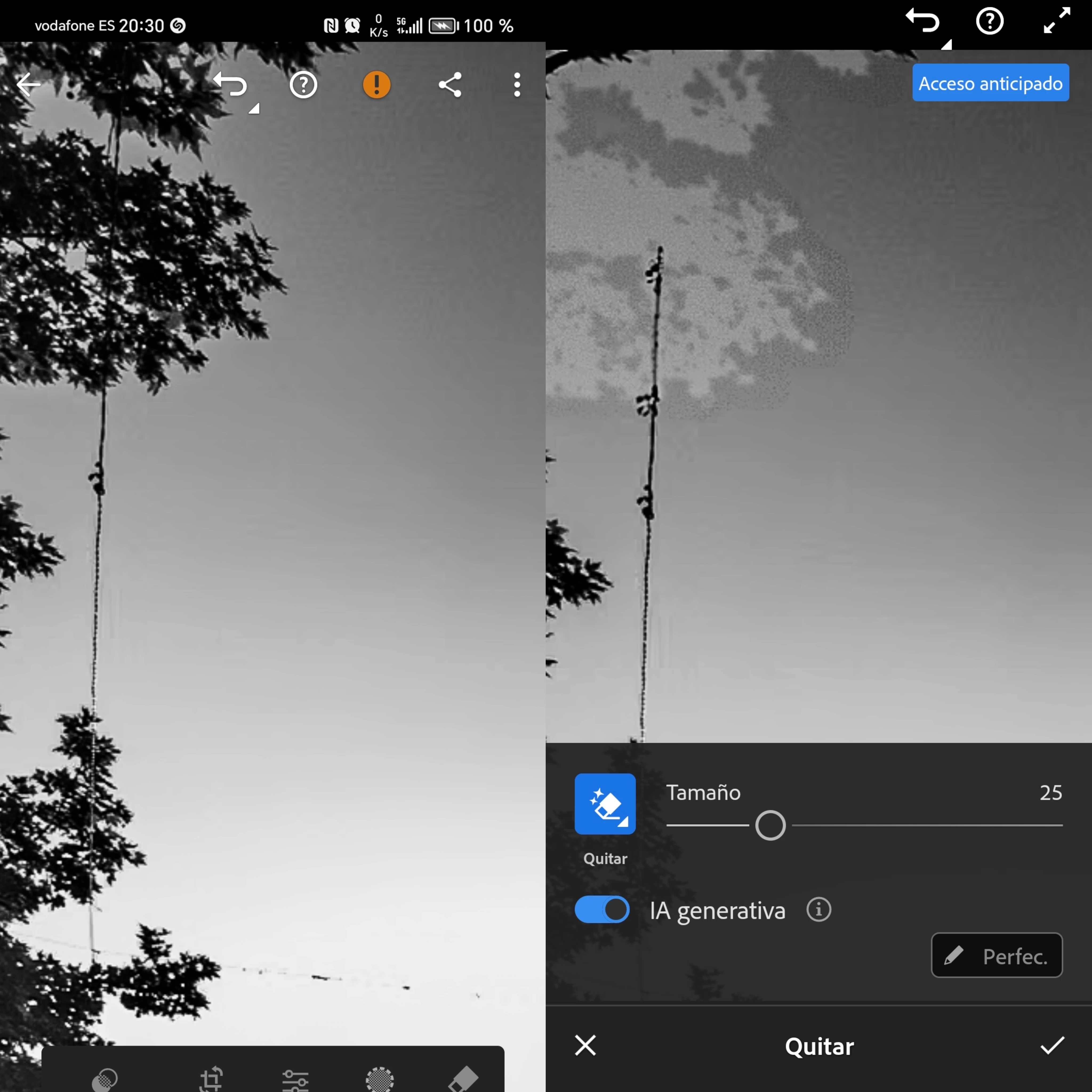 • Desde que instalé la última actualización de Lightroom para móviles Android, no funciona correctamente ninguna de tres herramientas de corrección (quitar/corregir/clonar). Siempre queda la silueta aclarada de lo que he intentado eliminar.