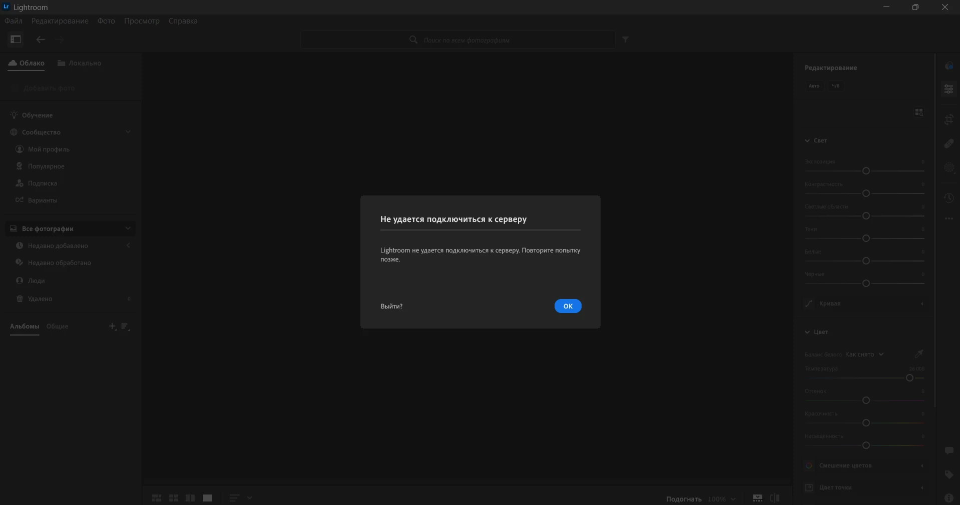 Здравствуйте, после входа в приложение adobe lightroom через секунд 20 высвечивает ошибку. Причина не удается подключиться к серверу. Lightroom не удается подключиться к серверу. Повторите попытку позже. Программа как будто запускается не полной. При открытии программы главный экран где должно быть предложение загрузить фото и так далее, окно темное. Большинство функций серые как по зеркалу. Какие варианты только не пробовал. Порекомендуйте пожалуйста решение данной проблемы. Нужно работать а данная ошибка мешает.