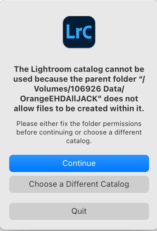 The Lightroom catalog cannot be used because the parent folder “/Volumes/106926 Data/Jacks ” does not allow files to be created within it.