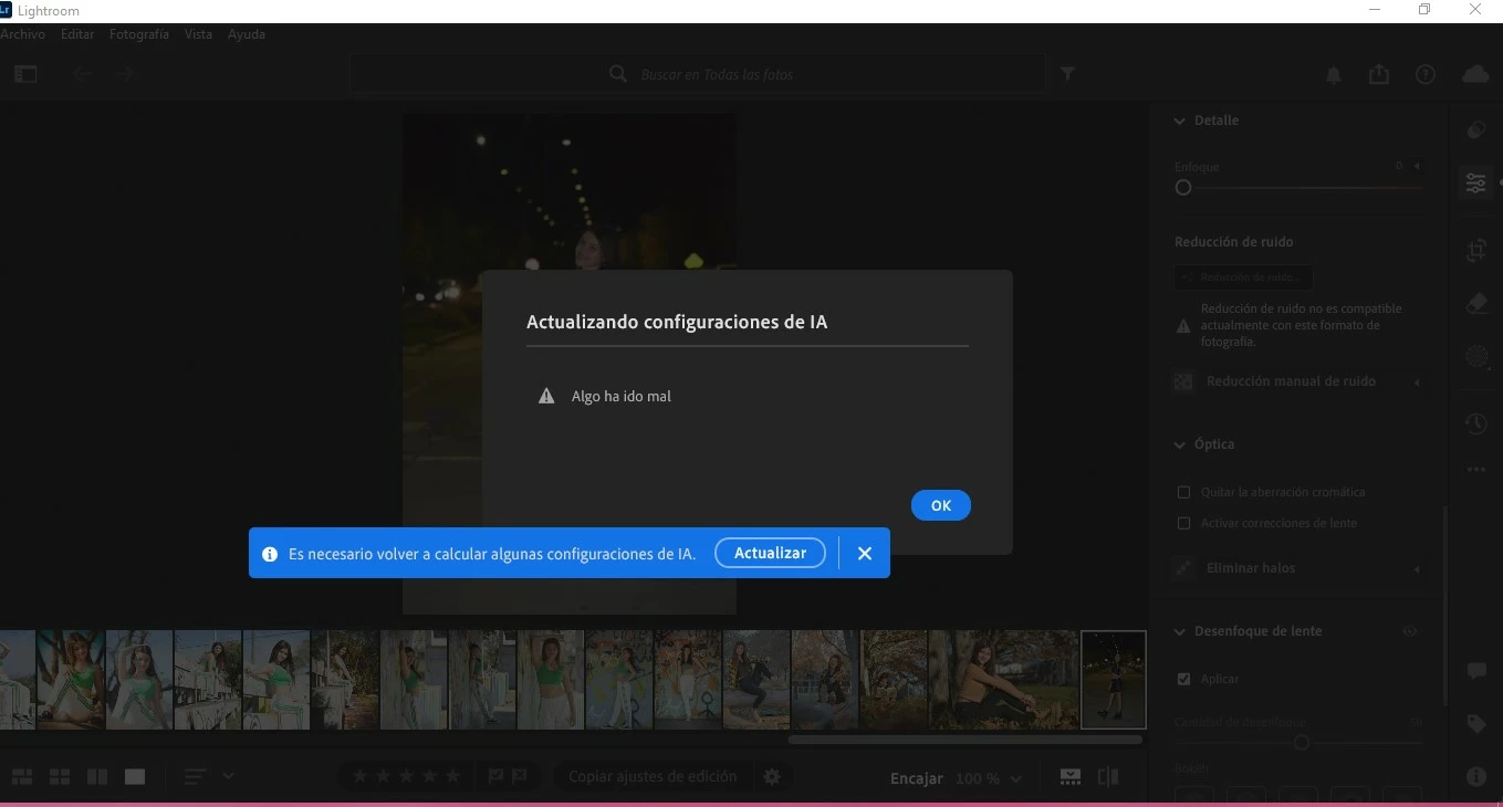 hola buenas noches, estoy trantando de aplicar en lightroom clasic, desenfoque del fondo y me dice que tengo que actualizar la IA lo hago y llega al 30% y luego se completa y ya me sale el error. a alguien mas me pasa, es una herramienta que uso mucho. gracias!
