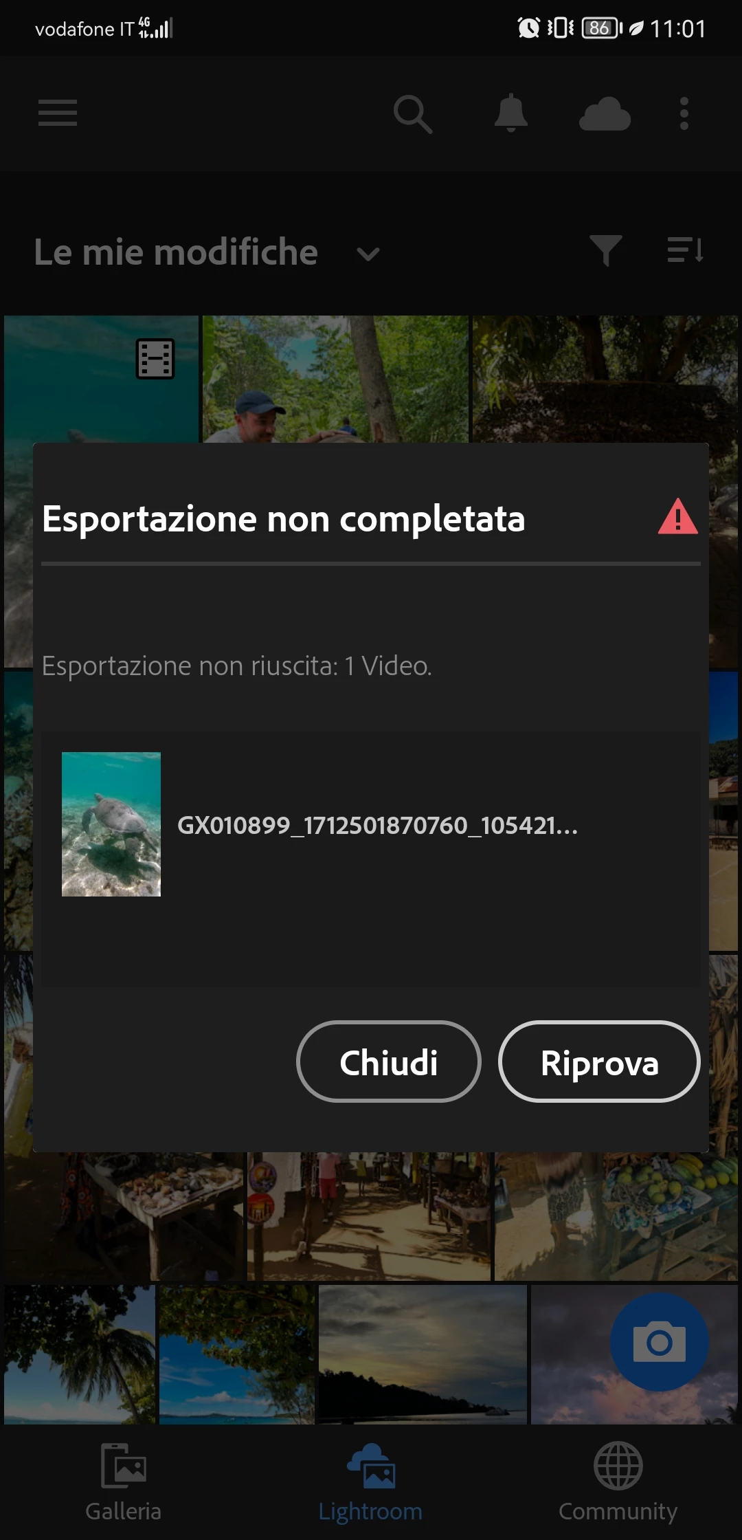 AAndrea36979096dtrdParticipantForum|Forum|2 years agoApril 25, 2024QuestionEsportazione non completataForum|Forum|2 years agoApril 25, 20240 replies123 viewsBuongiorno. Ho iniziato la versione di prova per lightroom ma dopo aver modificato un video mi esce l'errore "esportazione non completata". Come posso risolvere? Android