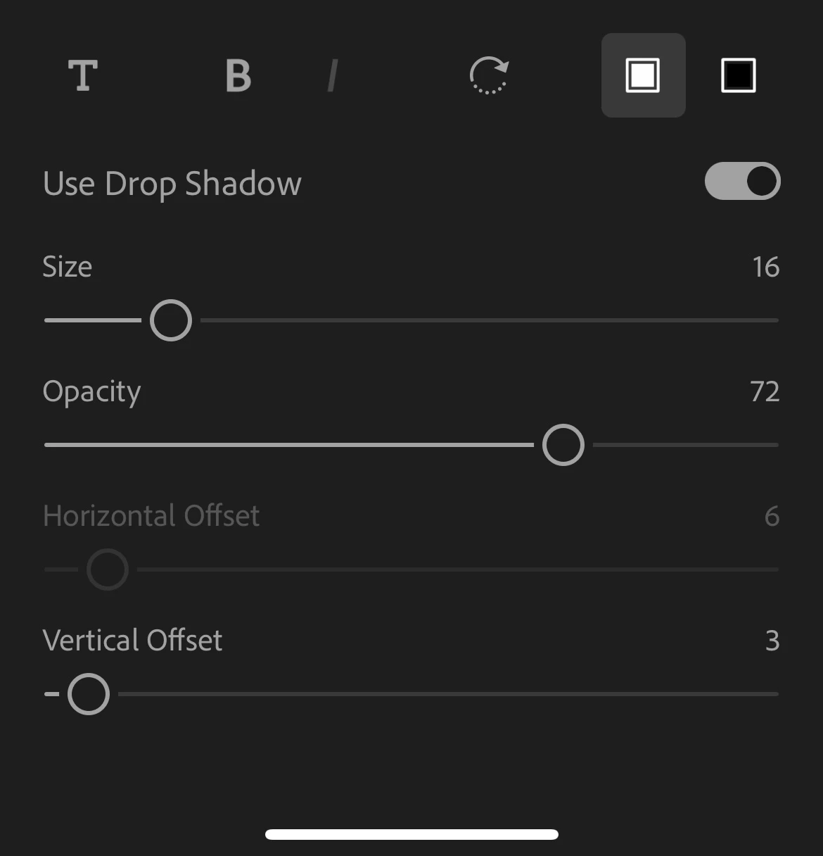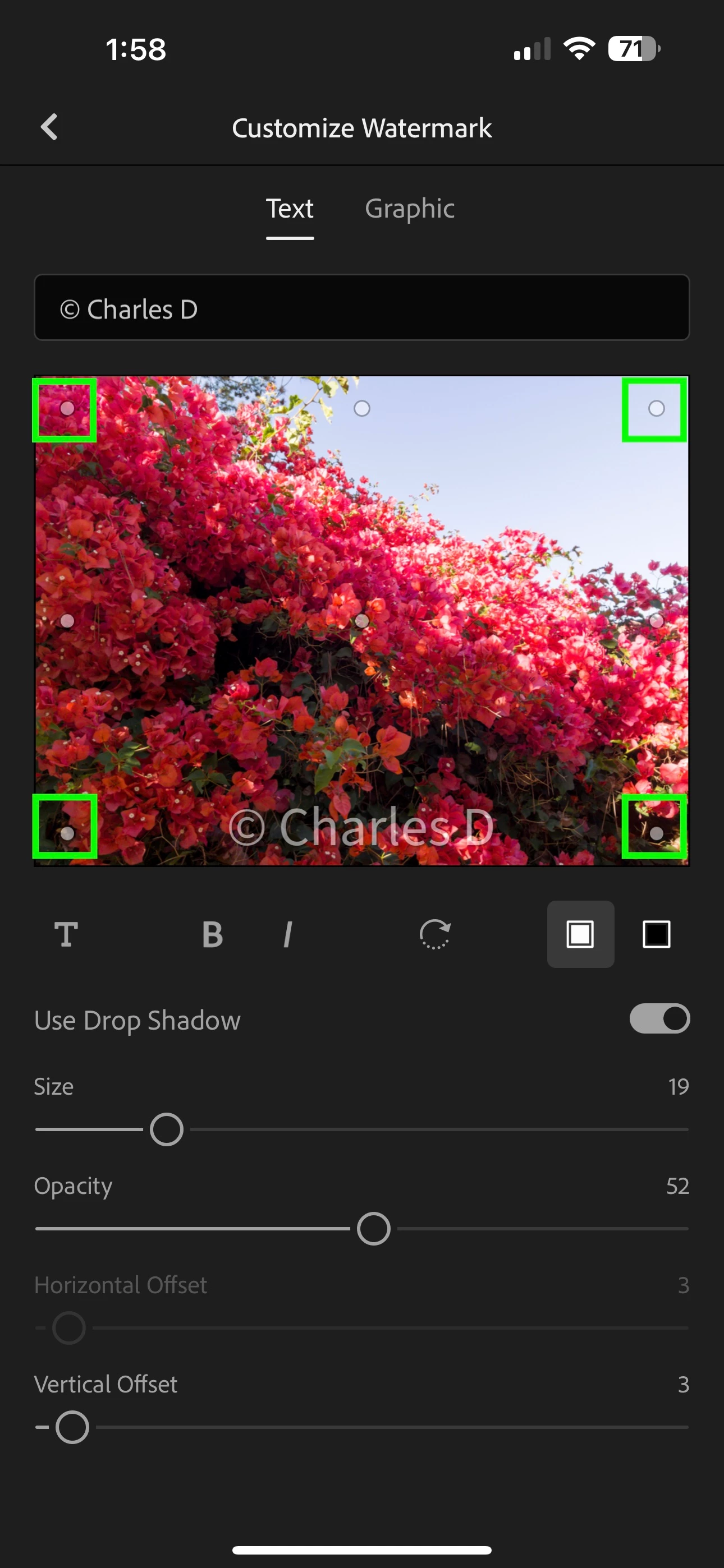 Your screenshot doesn't show the photo you are working with, so here's my own screenshot to show what I mean. To access Horizontal settings, tap on one of the dots in the corners of your image to anchor your watermark there. Then you will be able to nudge your Horizontal setting.