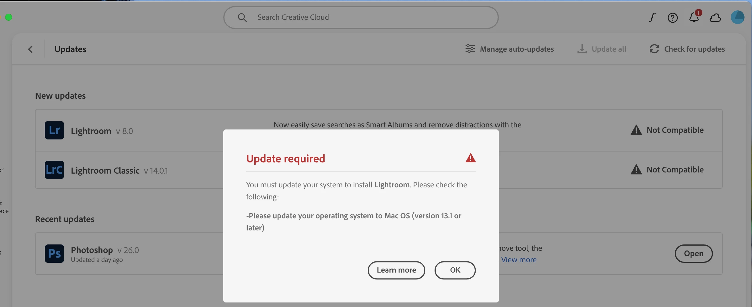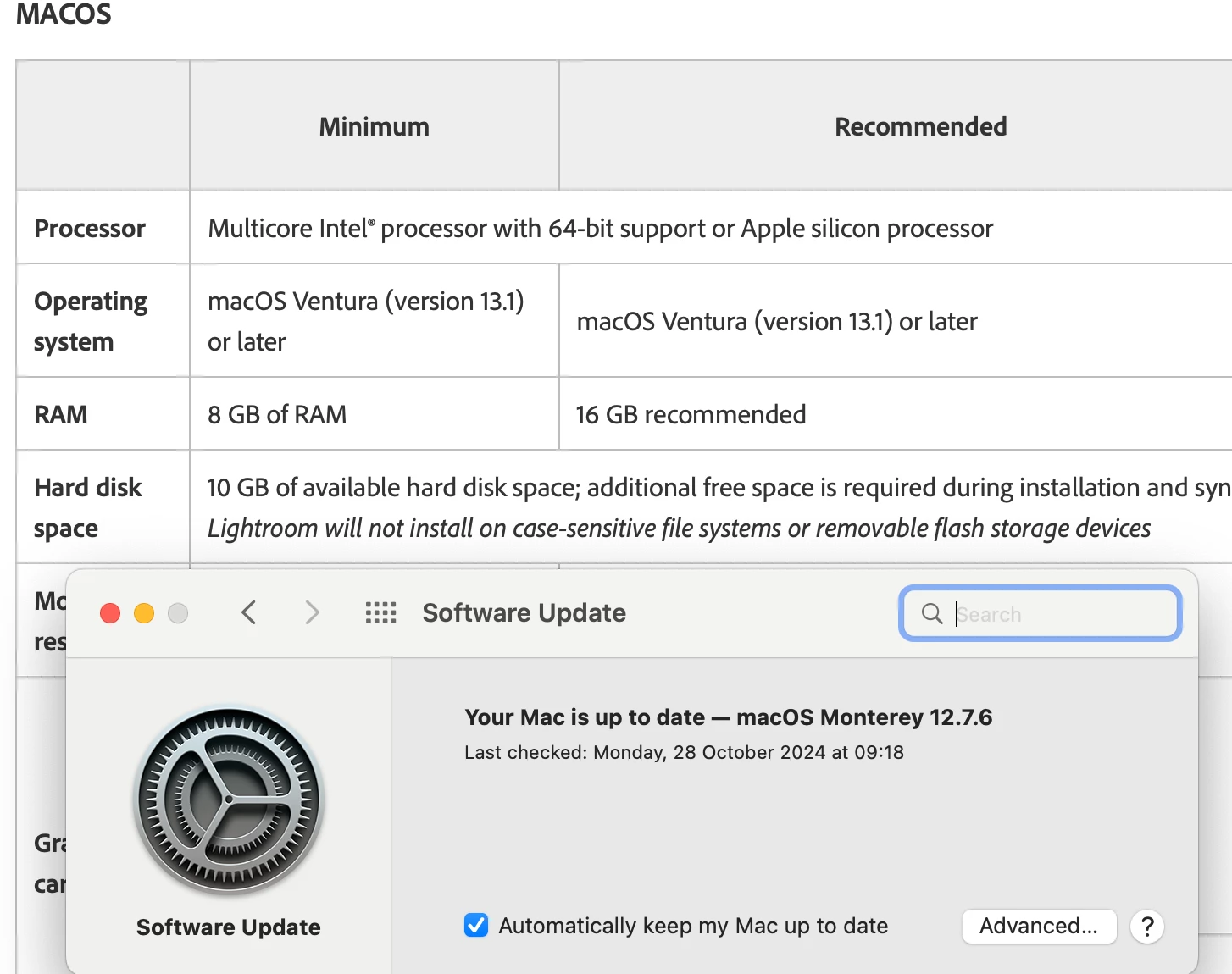 Adobe CC has kindly advised that both Lightroom Classic and CC cannot be updated on my iMac until the operating system is updated.