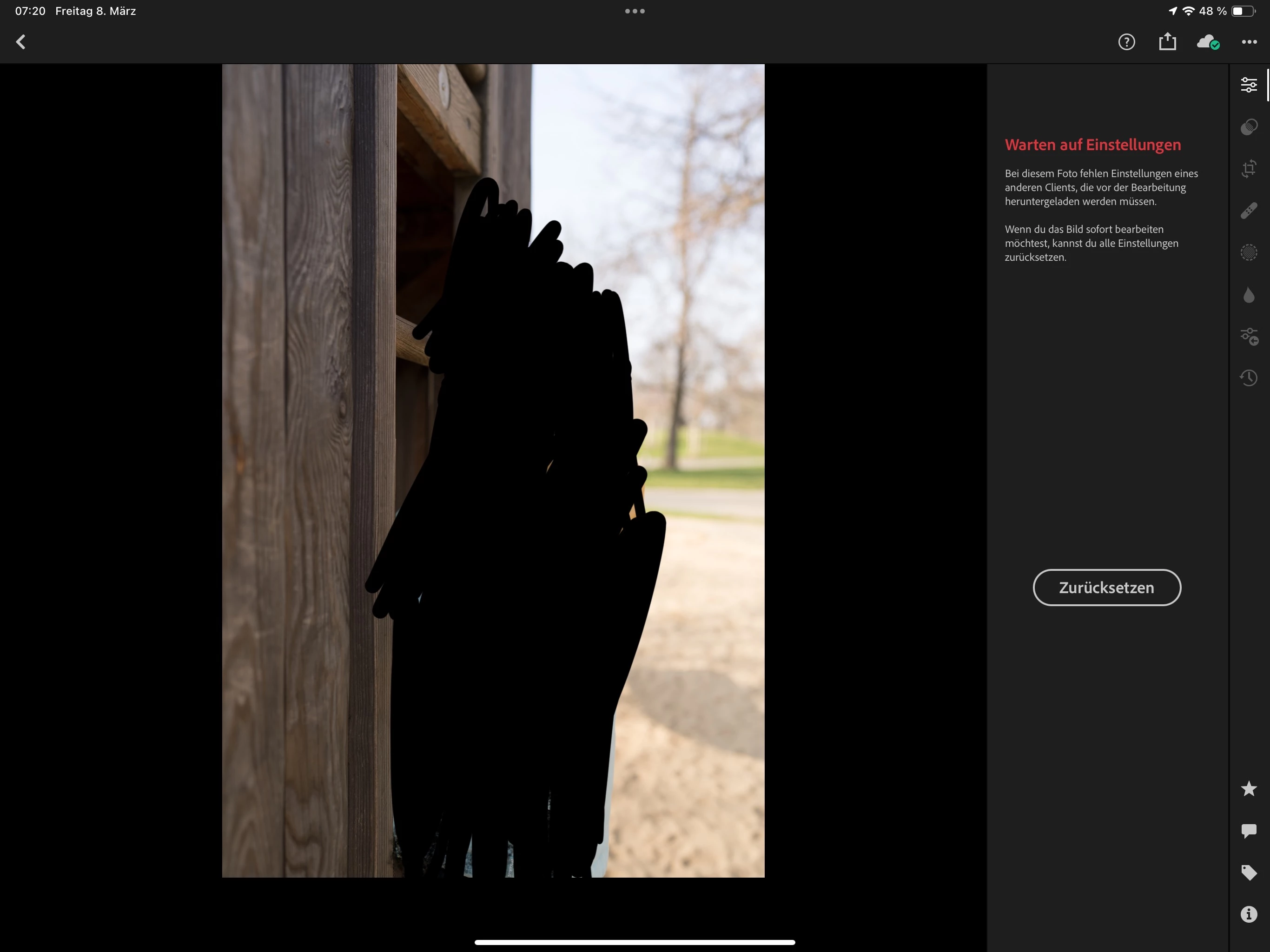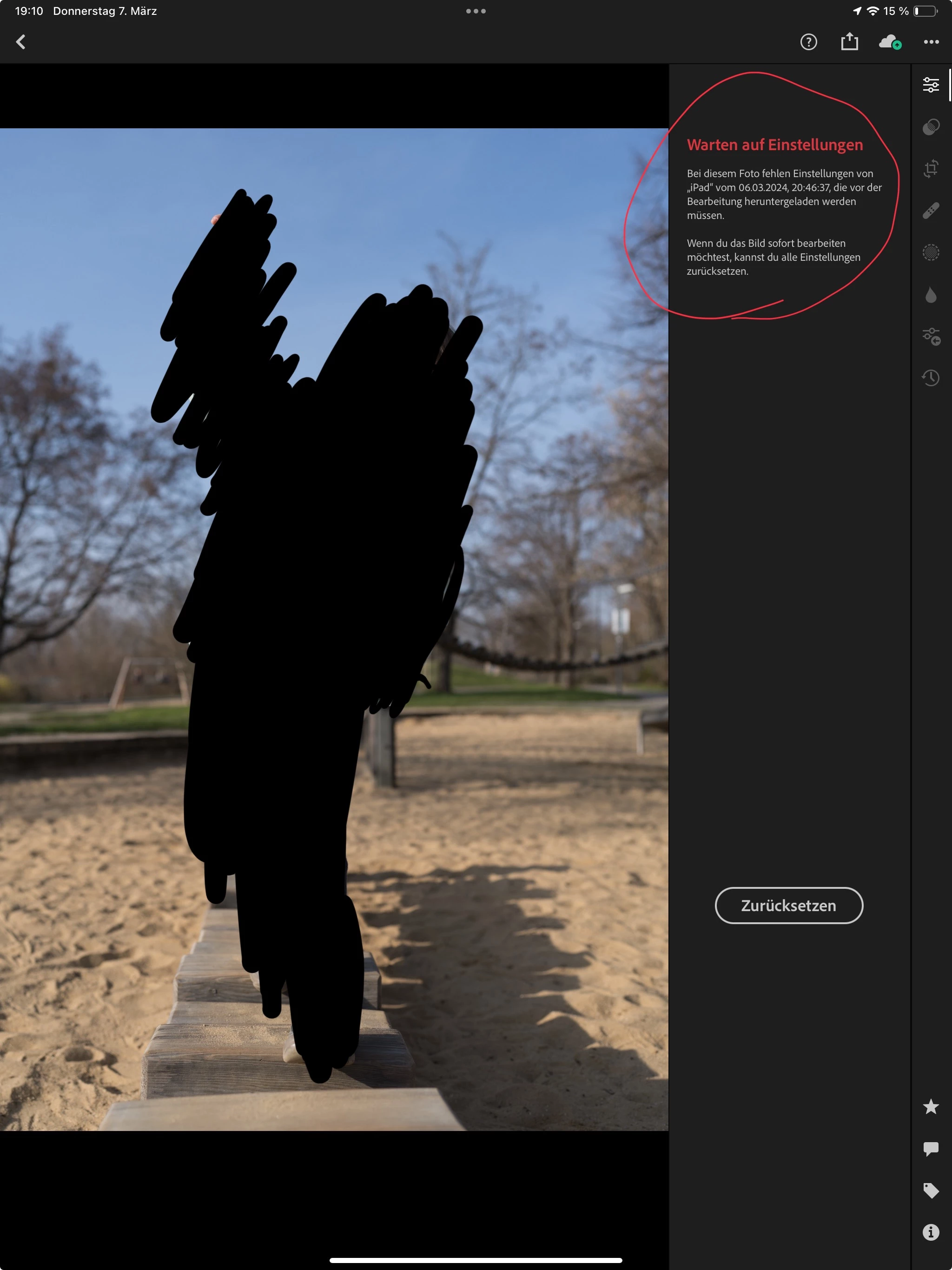 "Warten auf Einstellungen Bei diesem Foto fehlen Einstellungen von „iPad" vom 06.03.2024, 20:46:37, die vor der Bearbeitung heruntergeladen werden mussen.