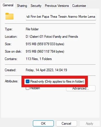 All of the files in the folder have the same permissions, none are set to read-only, and it does let me edit - it is more of an inconvenience of having to click ok on the box as I am going through the pictures.