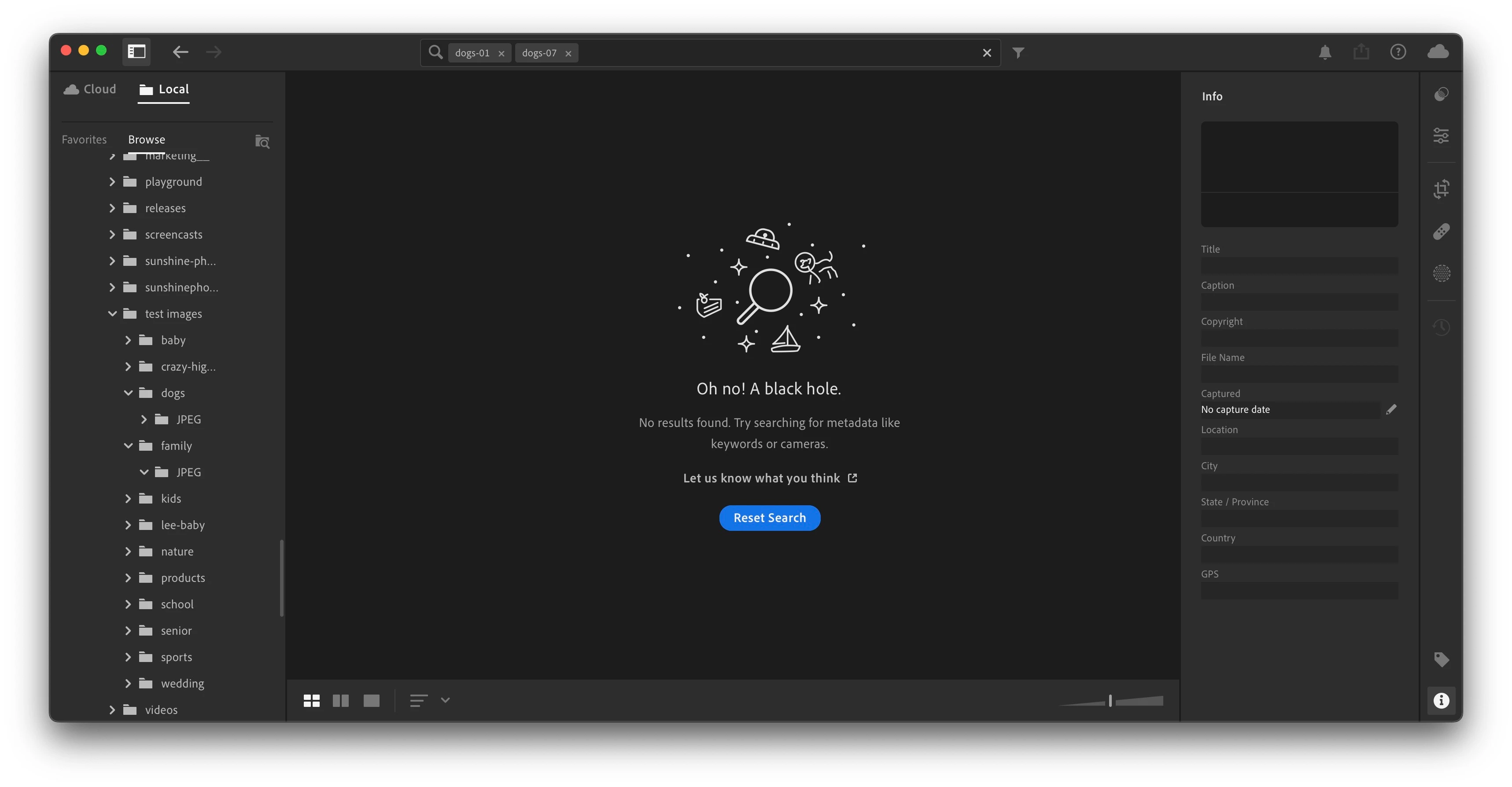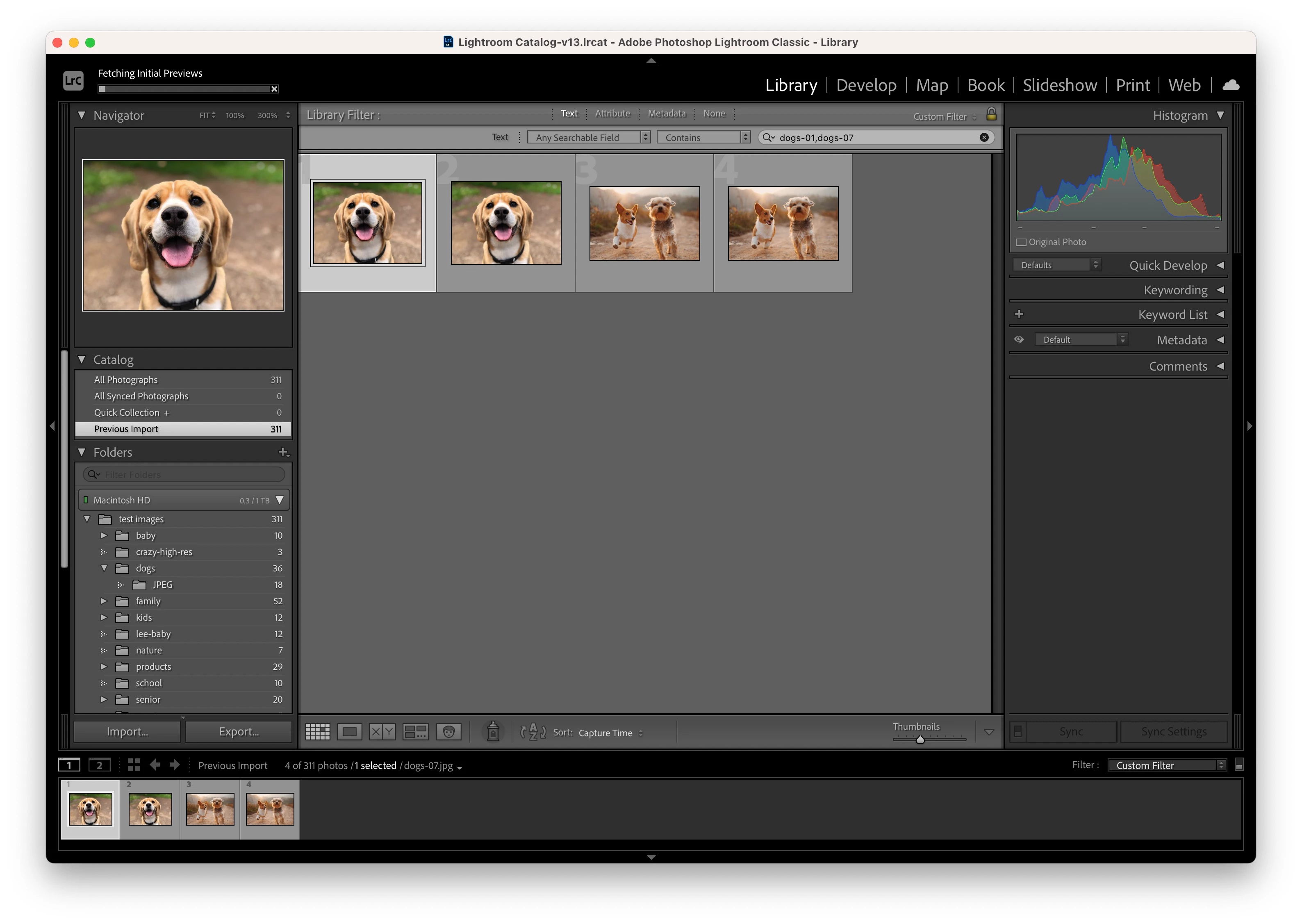 In Lightroom Classic, there is a "Contains All" filter option. So if I search "dogs-01,dogs-07" it will find both these images.