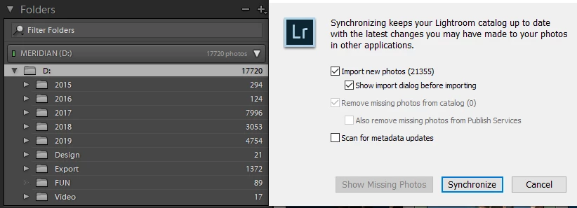 However when i click on syncronise folder, Lightroom thinks there is 21355 photos to import, but there are only 17720 to begin with, on top of that when i follow the synchronise button, it scans yet finds nothing but i cant get it to realise nothing has changed other than the folders have moved to the root?