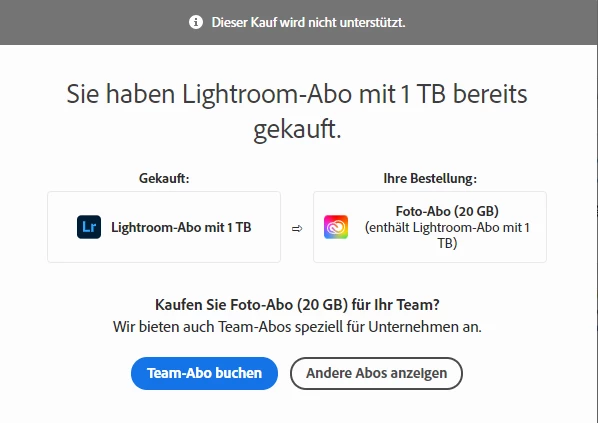 Sobald ich aber auf "kaufen" gehe meckert es beim Zahlvorgang rum uind sagt: "Sie haben Lightroom-Abo mit 1 TB bereits gekauft." und ich kann das Abo nicht abschließen!.