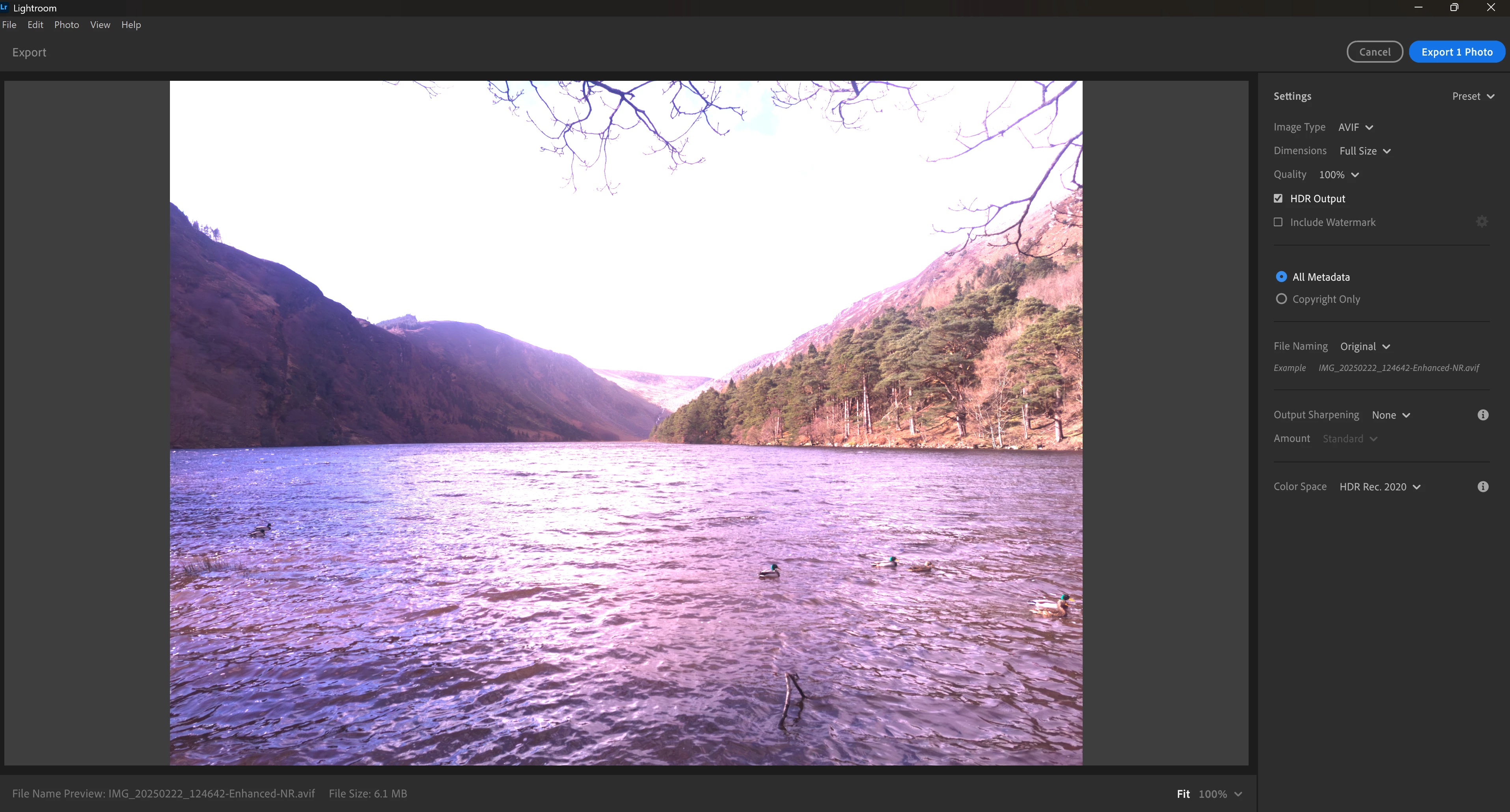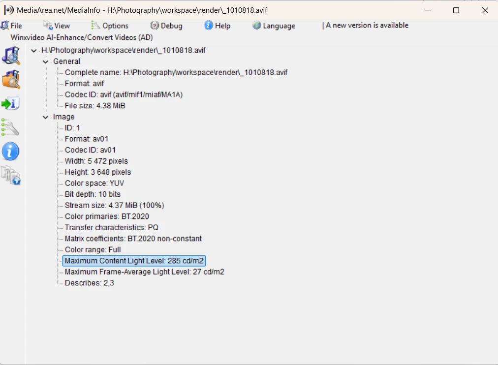 Now the issue with the exported HDR file is that it has significantly less cd/m^2 then the photo must have had in lightroom preview to nearly clip on my 700cd/m^2 HDR screen. The exported ones had numbers from 200cd/m^2 to 500cd/m^2 and were displayed by windows gallary (which supports avif and its hdr metadata) way darker then the preview looked in lightroom. It also got displayed as hdr. I tested this by making sure that the shown picture was not effected by the OS hdr content brightness slider which only makes sdr content match hdr color space and therefore only effects elements on screen that are sdr. And it did not change so it was properly read as HDR and displayed as HDR. I also have a media info Screenshot which shows the max brightness. Would be easily fixable by providing a setting for Maximum Content Light Level on export.