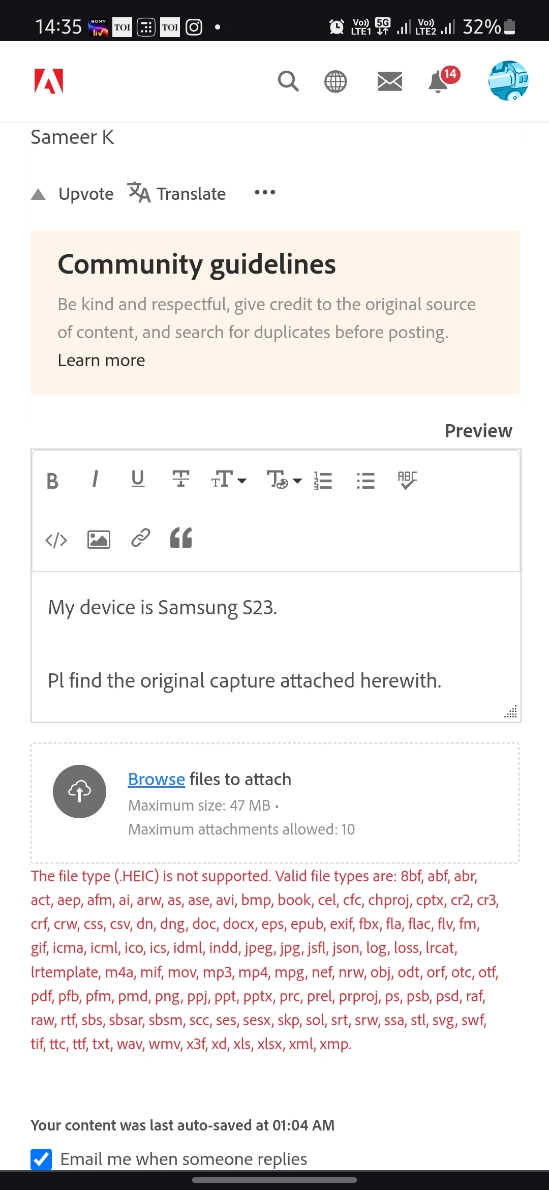 Well while trying to upload the original HEIC photo, I got error in Red on this website. Screenshot attach herewith.