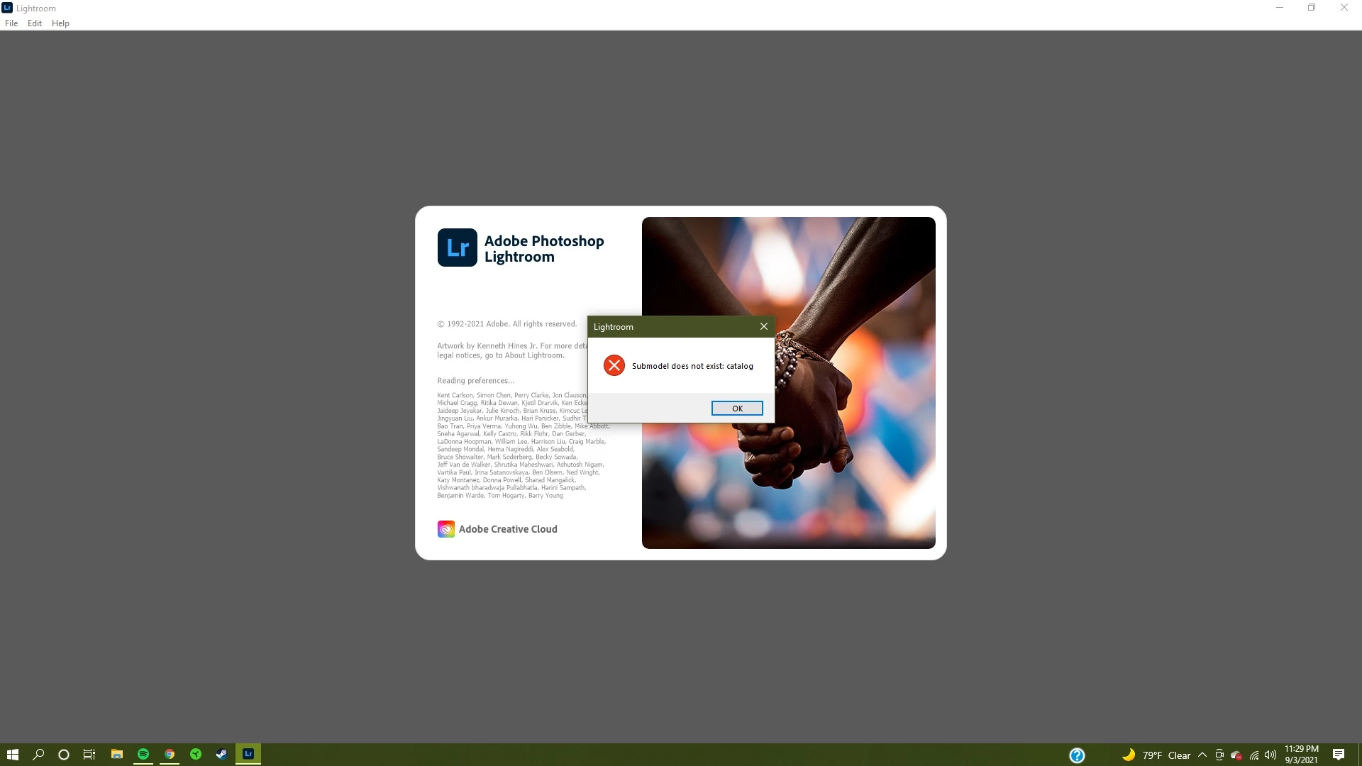 I've suddenly had a problem with lightroom giving me an error message reading "Submodel does not exist:catalog". Once I click okay, it prompts me with another error reading "Can only init the organize module once". Once I click okay the screen remains gray and I cannot do anything. Selections in the top left menus are greyed.