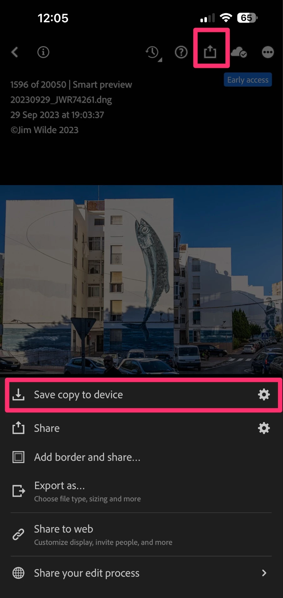 How do I export a new DNG photo to my camera roll?