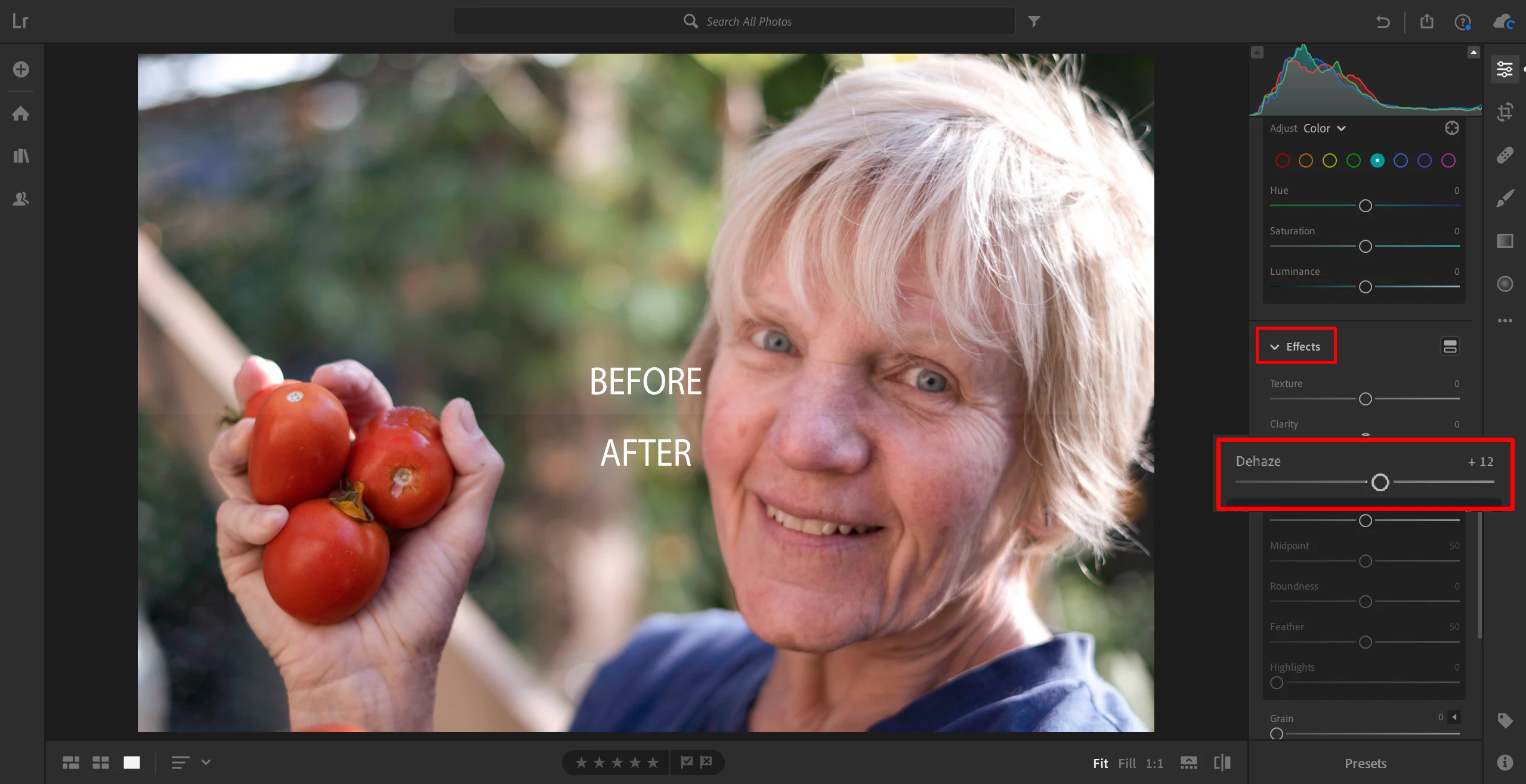 - Click & drag the Dehaze slider to increase or decrease the haze effect.