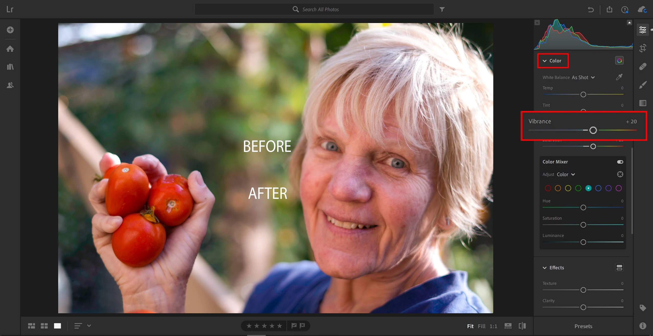 - The Vibrance slider is located under Color.