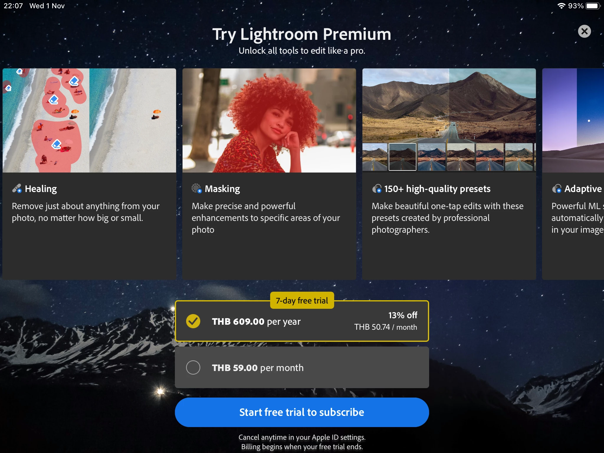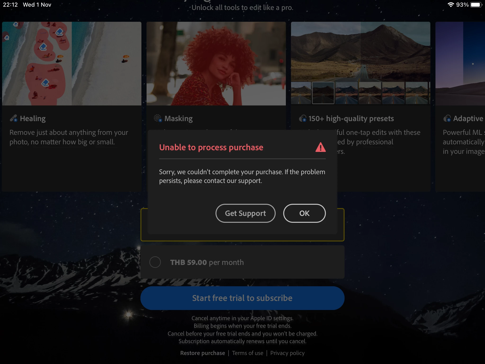 I try to restart my iPad , close and restart the Lr , re log in but I can not use premium Lightroom , even I paid already.