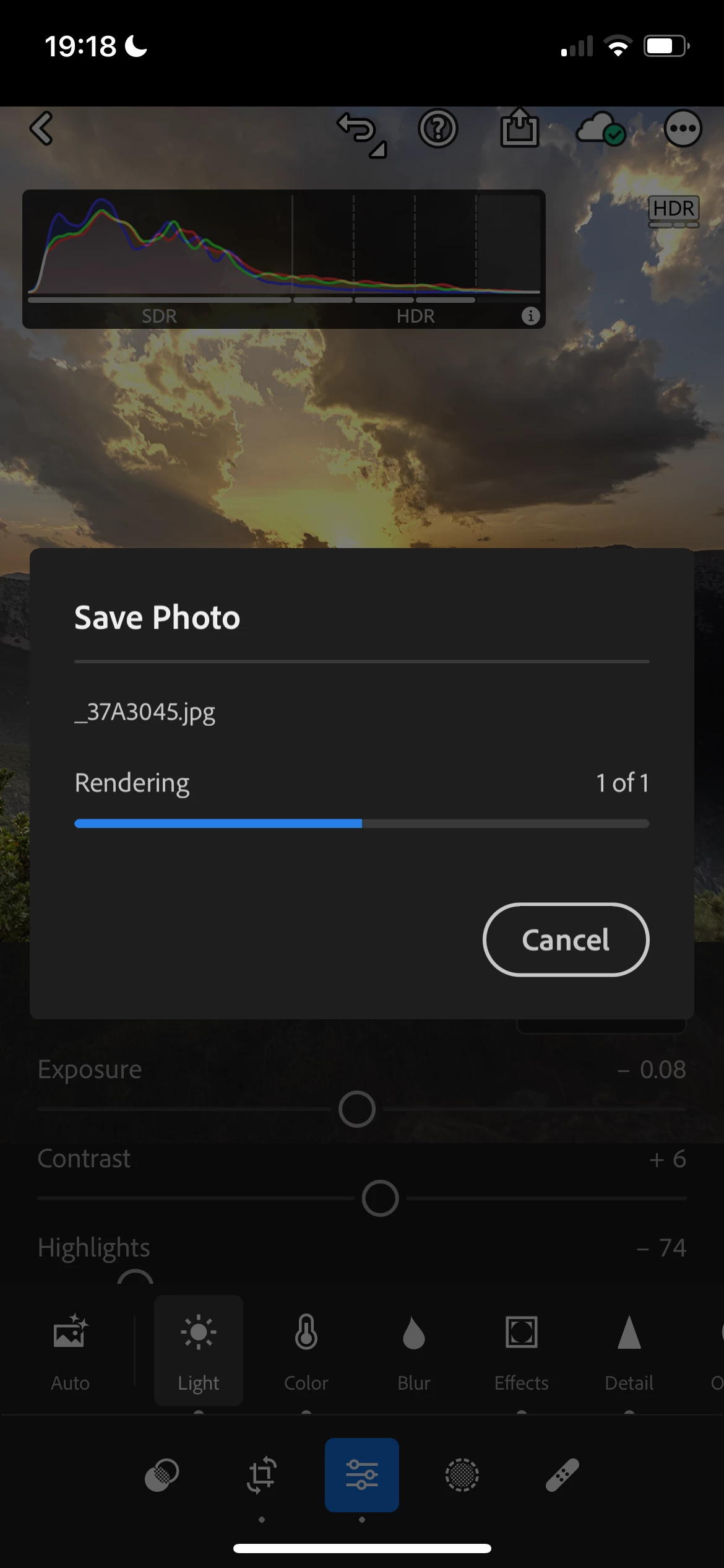 I have tried to save an image raw into hdr. When I try to save the photo the app say rendering and I can't save it. I have tried saving with other formats different from jpg as suggested by the app but I can't. I can only see and save the sdr version.
