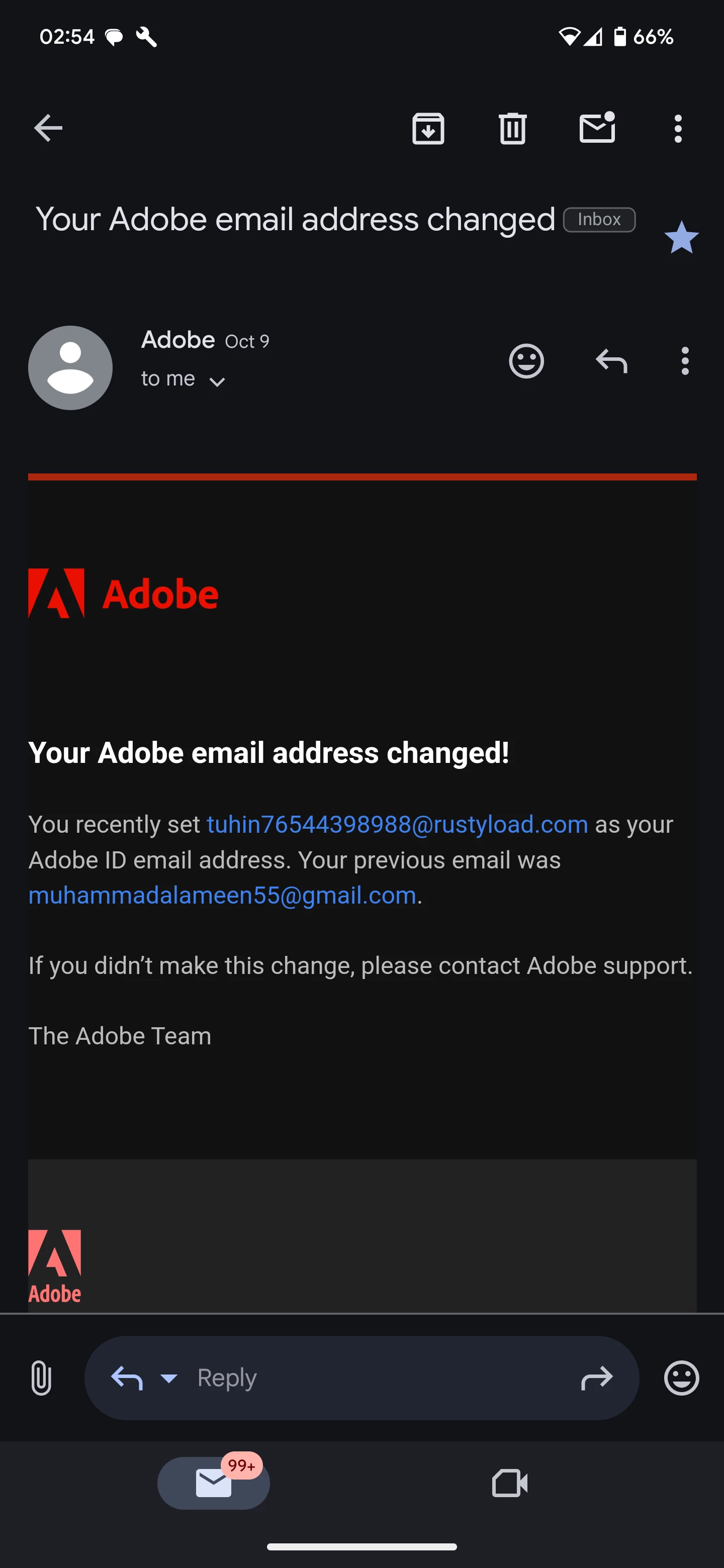 What happened was, on October 9th, I received an email saying that my Adobe ID email address has been changed from this email address to <tuhin76544398988@rustyload.com>. Did not read the email until two days later because Gmail though it was spam. The new email address is not mine, nor do I know whose email address it is. I lost access to two of my Adobe services (Behance and Lightroom Premium). Managed to recover my Behance account but can't say the same thing for Lightroom.