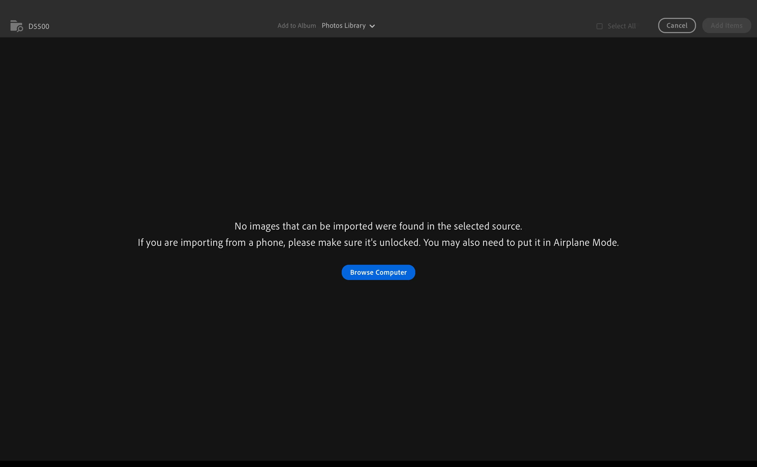 I found an error that tells me "no images that can be imported were found in the selected source" when using a cable to connect my Nikon D5500 camera and lightroom. Strangely, the camera can import perfectly to apple photos through the same method, but the finder application doesn't ever display it at all. My Macos is Sonoma 14.6.1. Is this a file compatibility issue/how can I fix it? Thanks