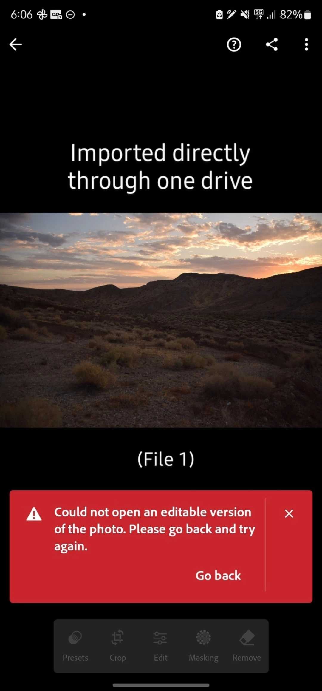 Hi. I use the app Lightroom on my phone (Google Pixel 8 Pro and Samsung Galaxy S23 Ultra). For over a month I have been having a new issue with Lightroom. I am unable to import images directly from my One Drive files into Lightroom. Each time I attempt to do so a warning message in red pops up in the Lightroom app saying "Could not open an editable version of the photo. Please go back and try again". All the files are in RAW format, not edited whatsoever. The camera I use is a Nikon D5300.