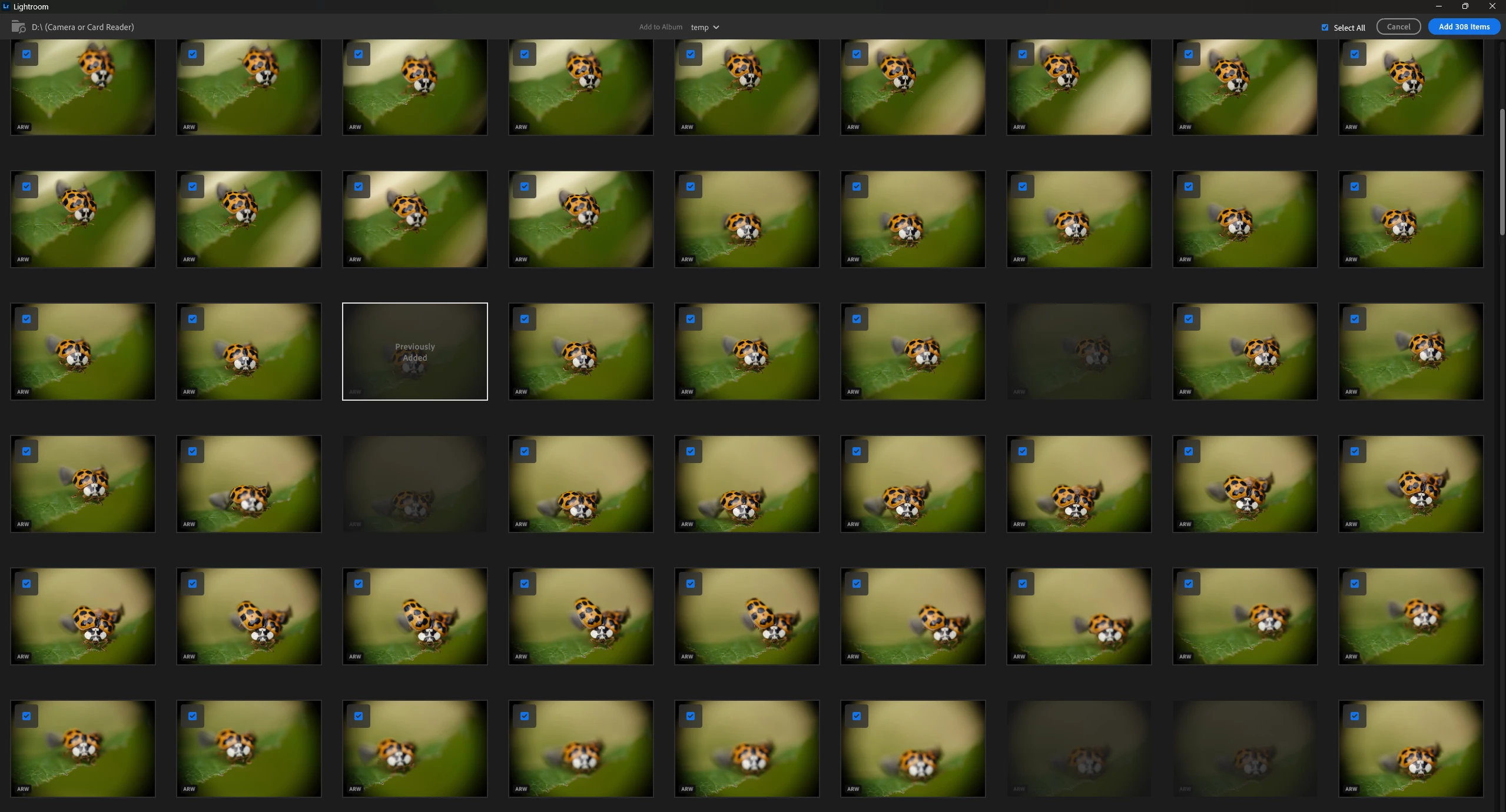 I'm trying to import new photos from my SD card, but LR tells me some of them are previously added and won't let me select them.