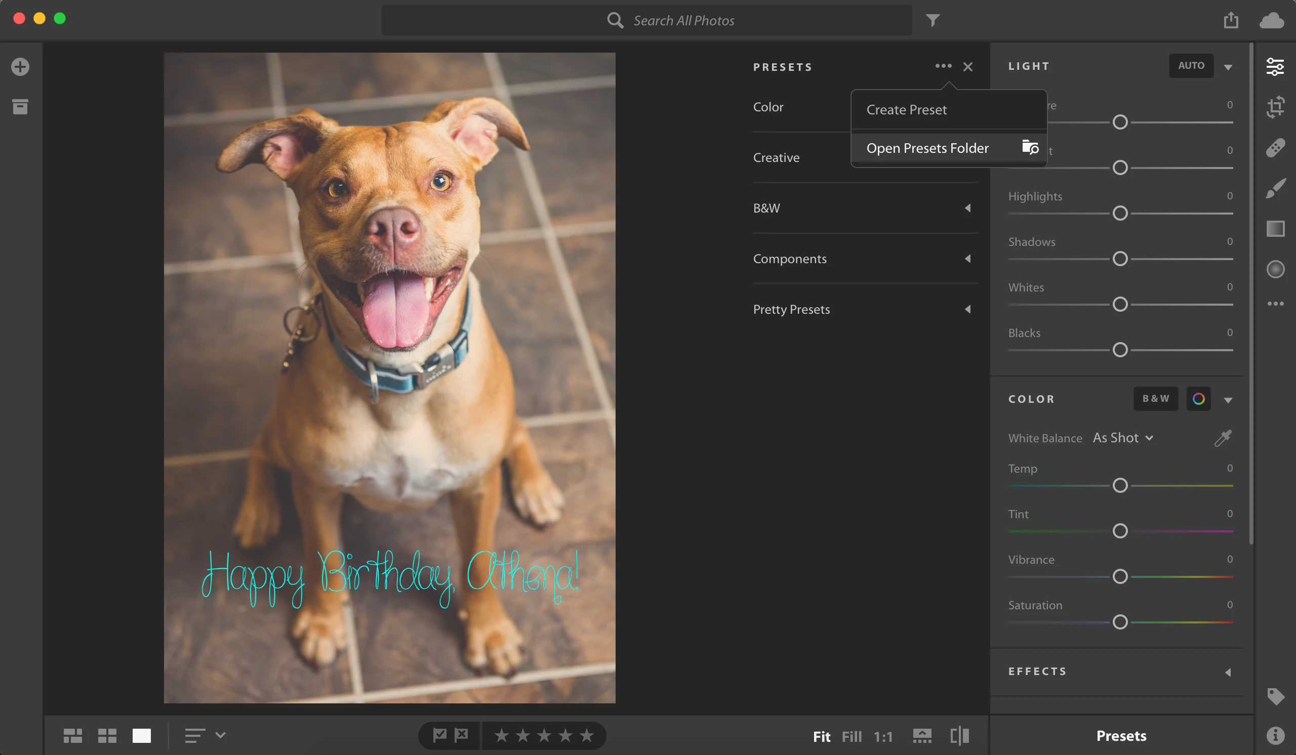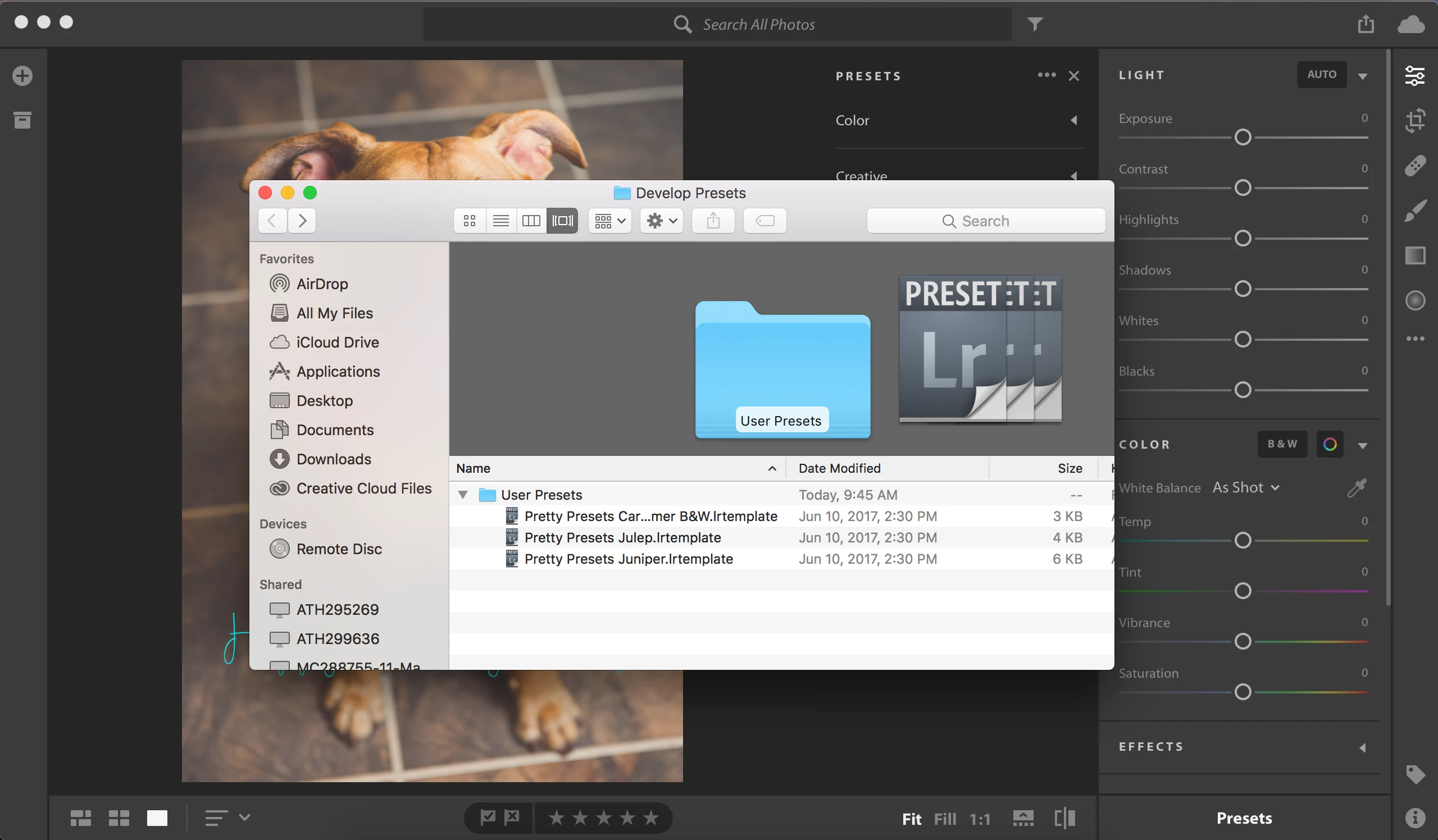 In Lightroom CC, make sure the Edit panel is open (shortcut E). At the bottom of the panel, select "Presets". This will slide out another panel. At the top of that panel, click on the three dots (...) at the top. Then select "Open Presets Folder". This opens a window.