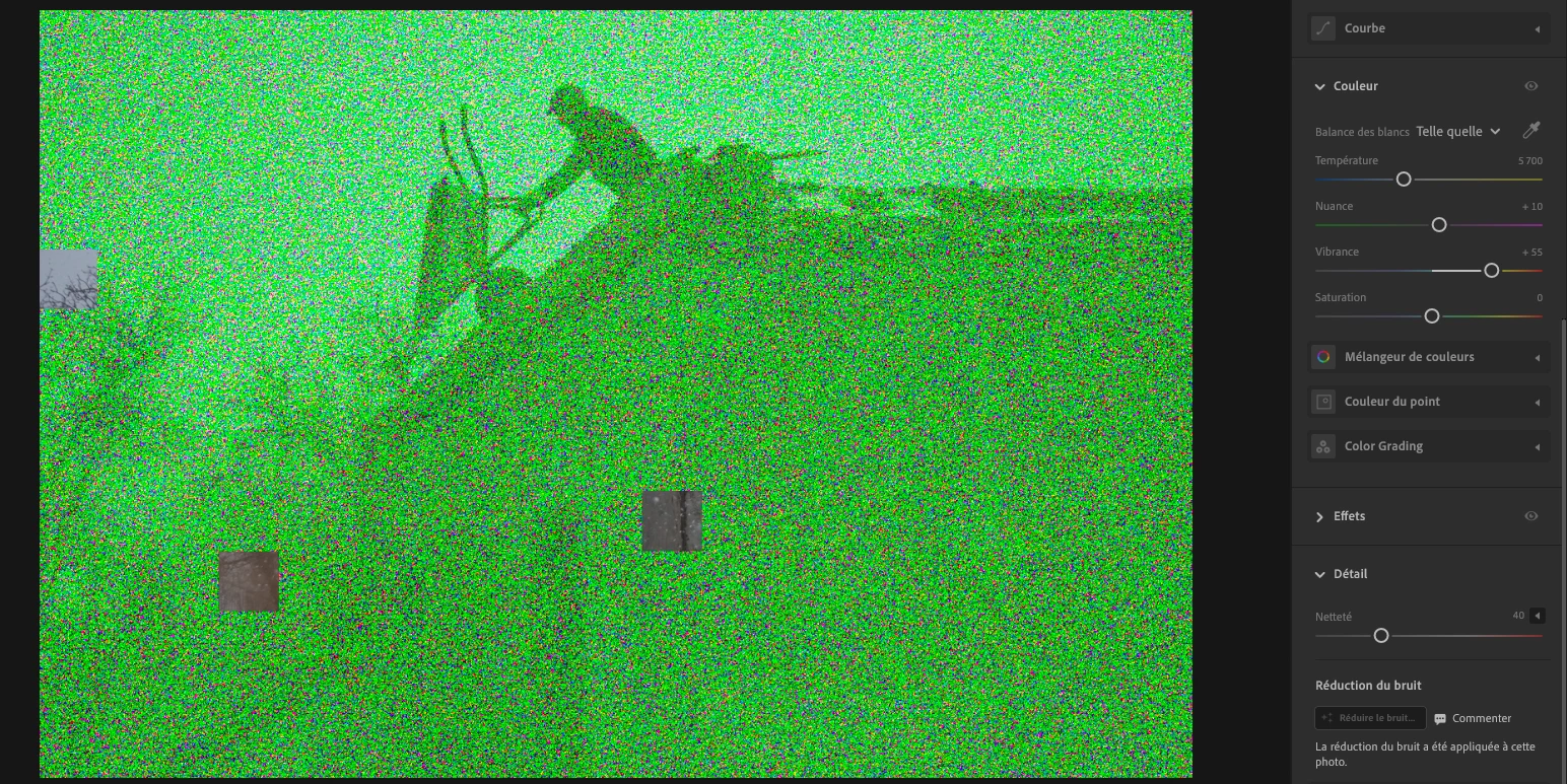 Après des années d'utilisation de Lightroom, je constate soudainement que l'option de réduction de bruit via IA couvre mes photos de pixels verts. J'ai désintallé l'application et l'ai réinstallé, même problème. En revanche, ma collègue qui est sur son propre ordinateur avec la même session Lightroom et à partir de la même photo, y parvient très bien. Avez vous des solutions ?