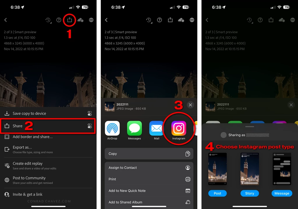 While in instagram I can add from my iPhone photos, but I can't access Lightroom. Suggestions?