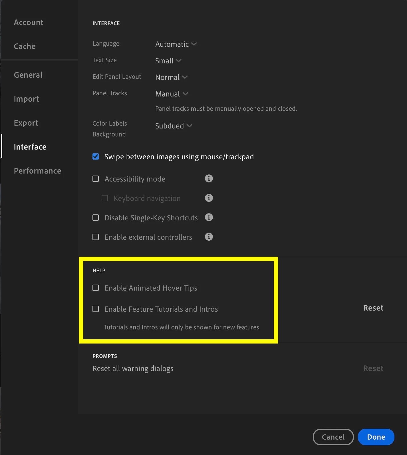 You can disable tool tips and feature tutorials in Lightroom's Preferences.