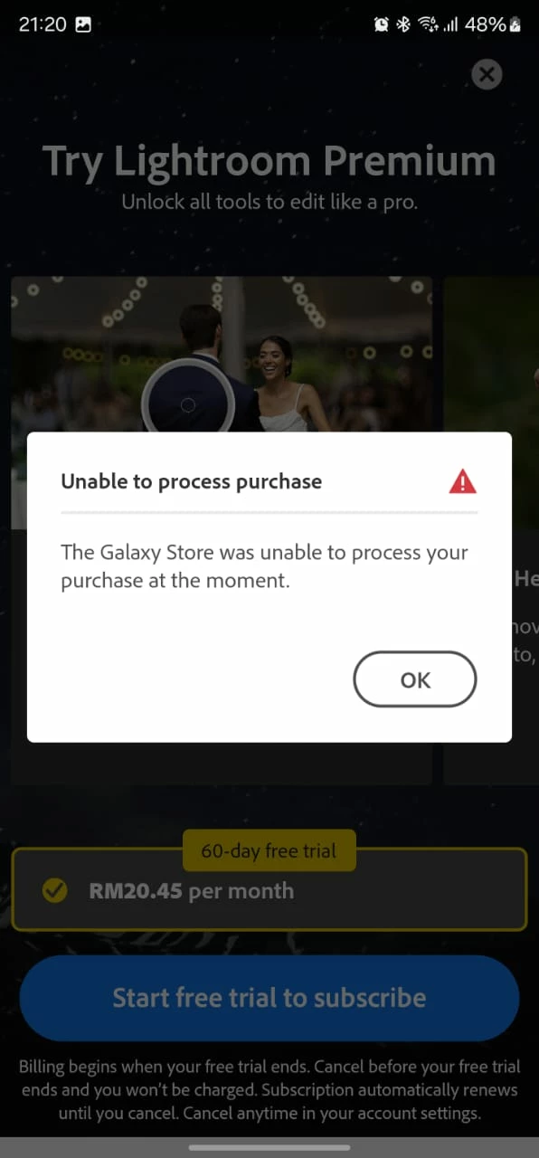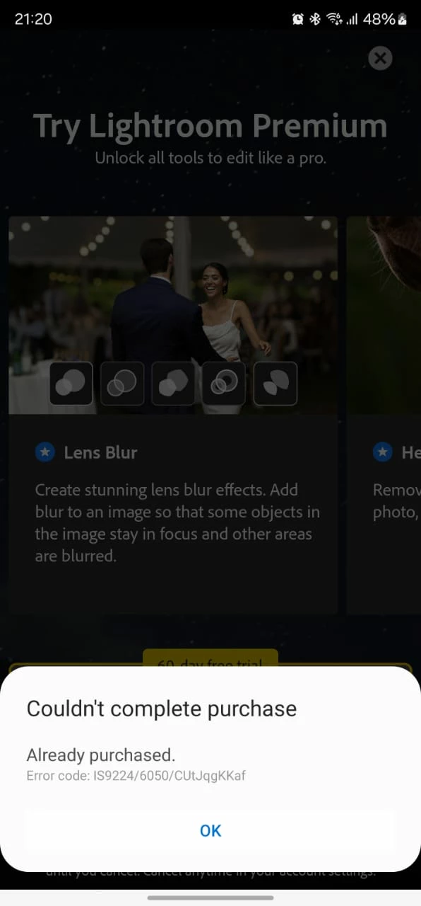 I initially subscribed on December 5th and later unsubscribed because the premium features were still locked and could not be accessed. However, when attempting to resubscribe, I'm encountering an error stating that the purchase has already been made. Despite canceling the previous subscription, I'm unable to subscribe again, and the Adobe Lightroom Mobile app on my Galaxy device cannot process the purchase.