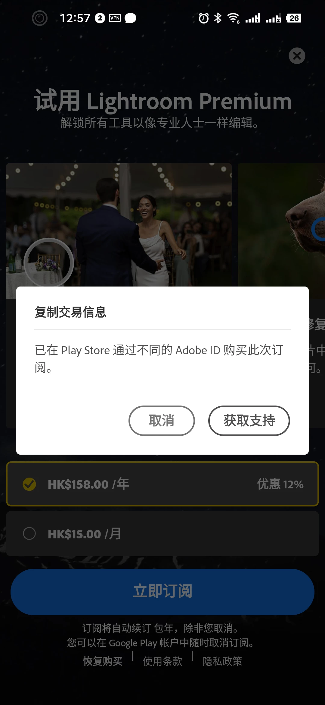 Dear Lr Team , Greetings! I am a novice user of the Lr Mobile application and thoroughly enjoy your app. However, I've recently encountered an issue which I hope you can assist me with. Previously, I completed an annual subscription to Lr Mobile using my Google account associated with Email A. At the time of subscription, the email I used was Email B, not my Google account. Hence, my Adobe ID and Google account do not align. I recently switched to a new phone and have encountered a problem. I am unable to restore my annual subscription when logging in with my Adobe account on the new device. I believe this issue might be due to the Adobe ID and the Google account used for subscription not being the same. I am troubled by this problem and sincerely hope to continue using your fantastic application. I would greatly appreciate your guidance on how to restore my annual subscription on my new phone. I eagerly await your response.
