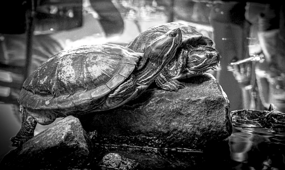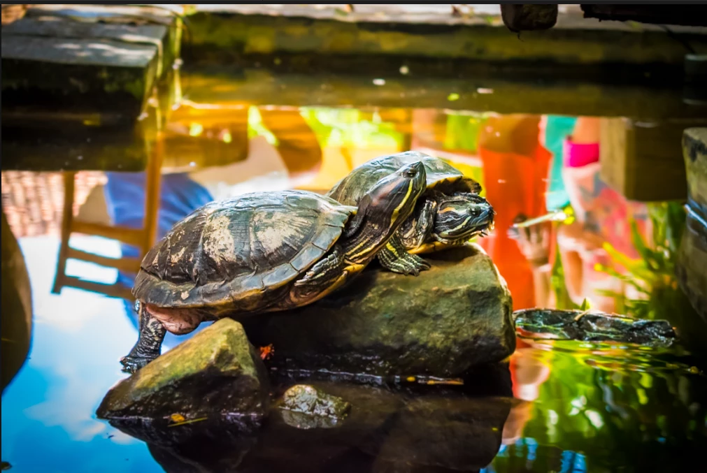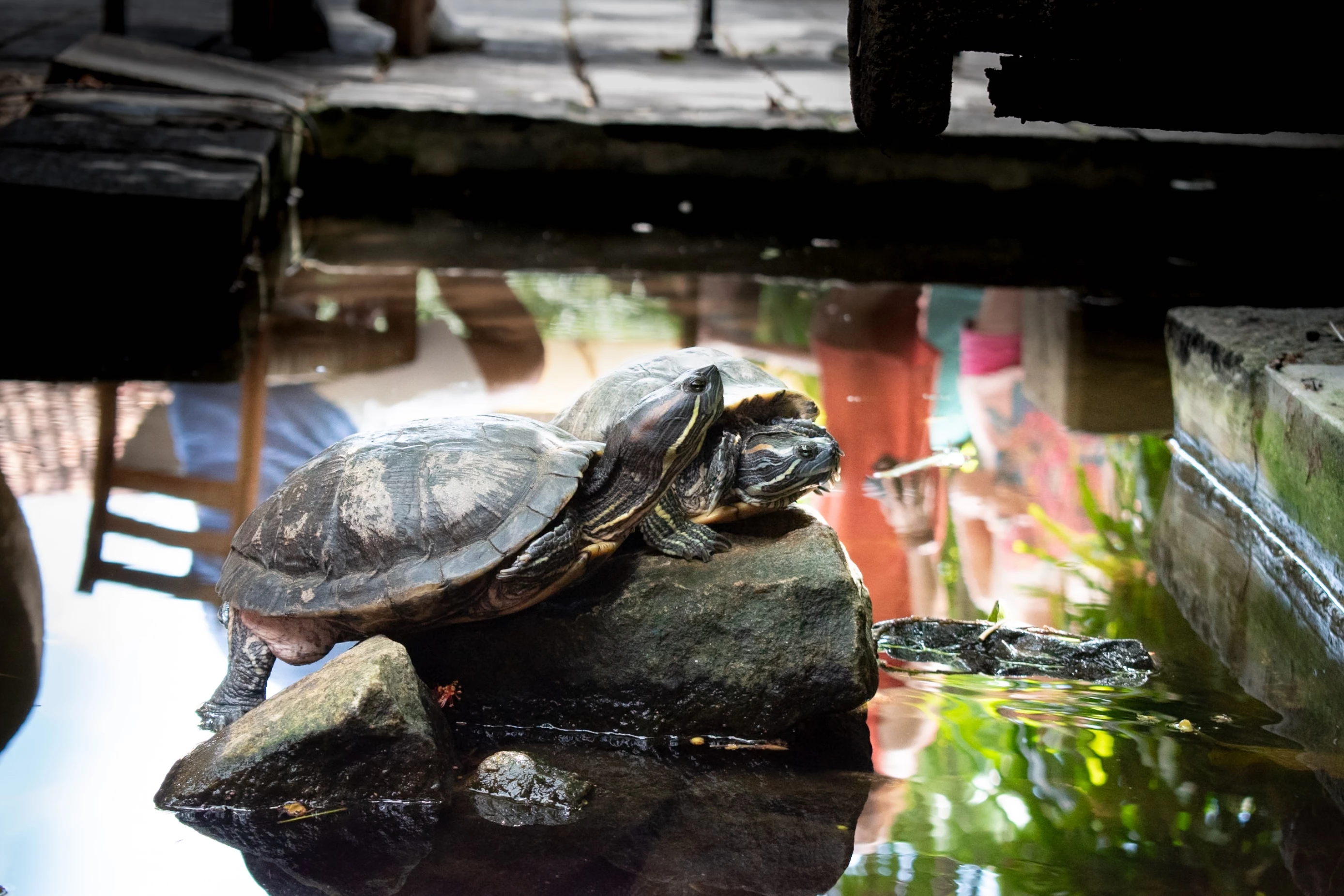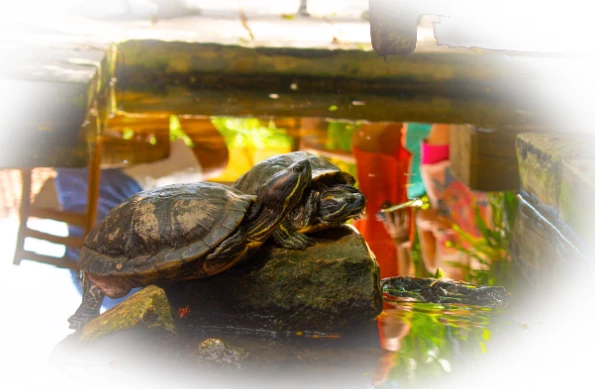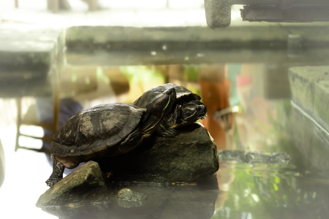 The Red-Eared Slider is one of the most popular pet turtles in the world. These turtles are semi-aquatic, spending much of their time in the water but often basking on rocks or logs to soak up the sun. Found these two in a small pond in a cafe in Sri Lanka.