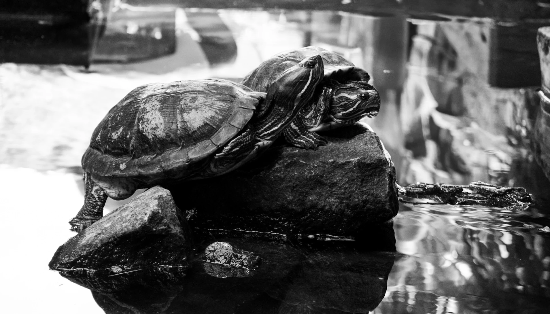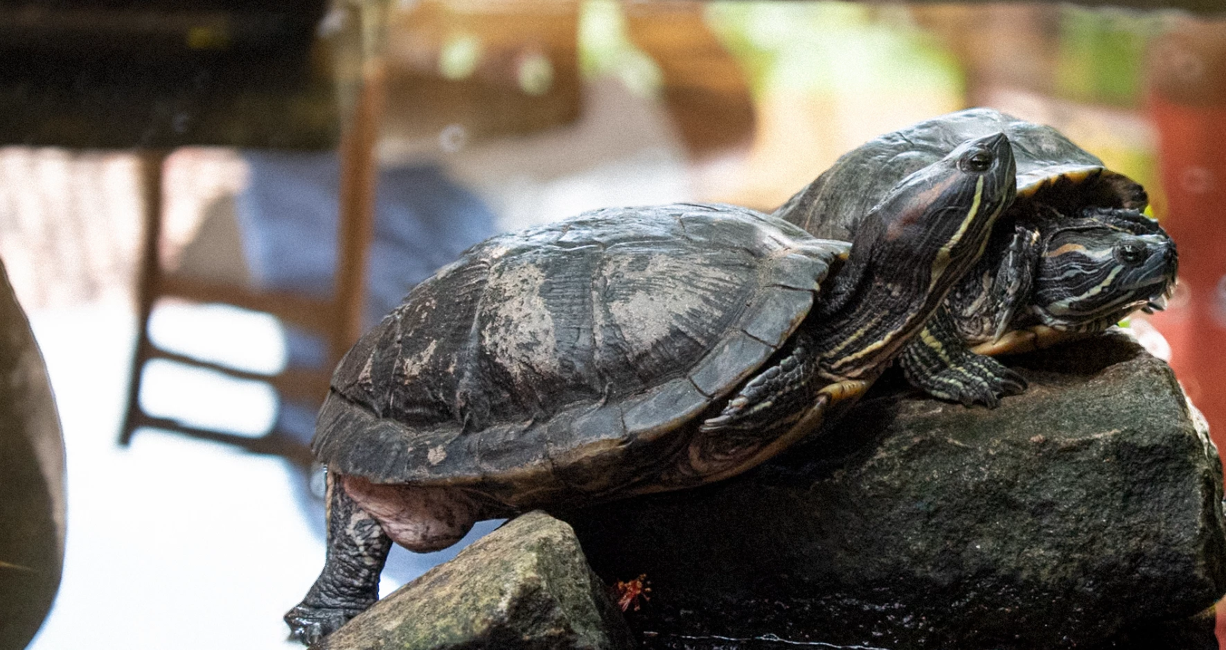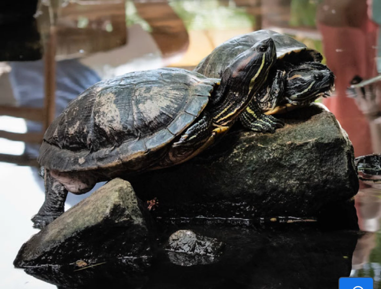 The Red-Eared Slider is one of the most popular pet turtles in the world. These turtles are semi-aquatic, spending much of their time in the water but often basking on rocks or logs to soak up the sun. Found these two in a small pond in a cafe in Sri Lanka.