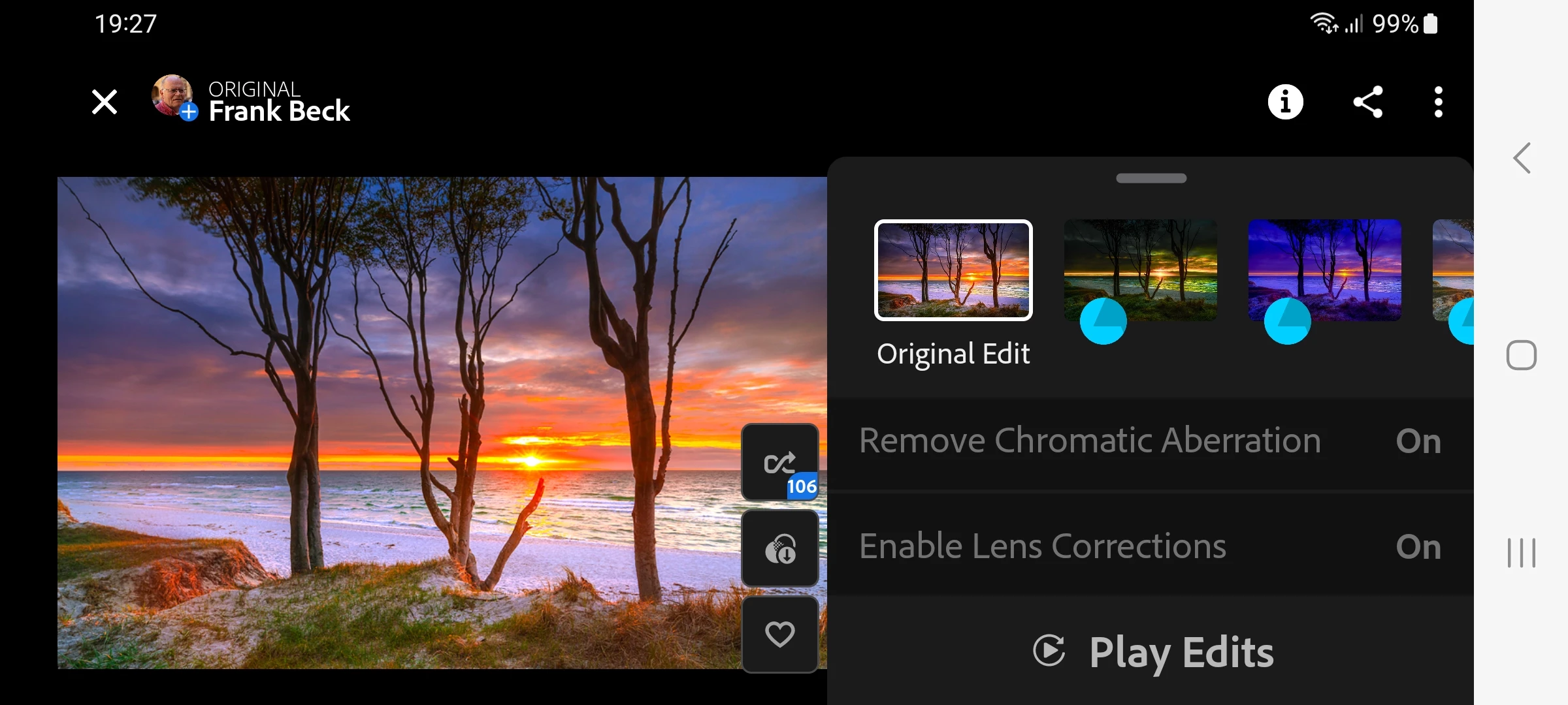 When you are looking at a Discover landscape photos and turn your phone (tablet) sidewase into landscape, half the screen is taken up by the Edits panel.
