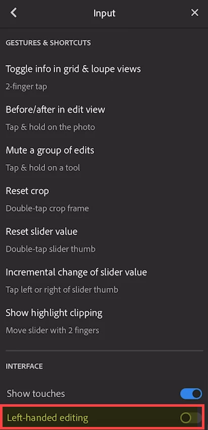 As a left handed user I cannot change the menu bar to the left, now when I am editing my hand covers the screen which I cannot follow the changes on my photo. I am using lightroom on ipad