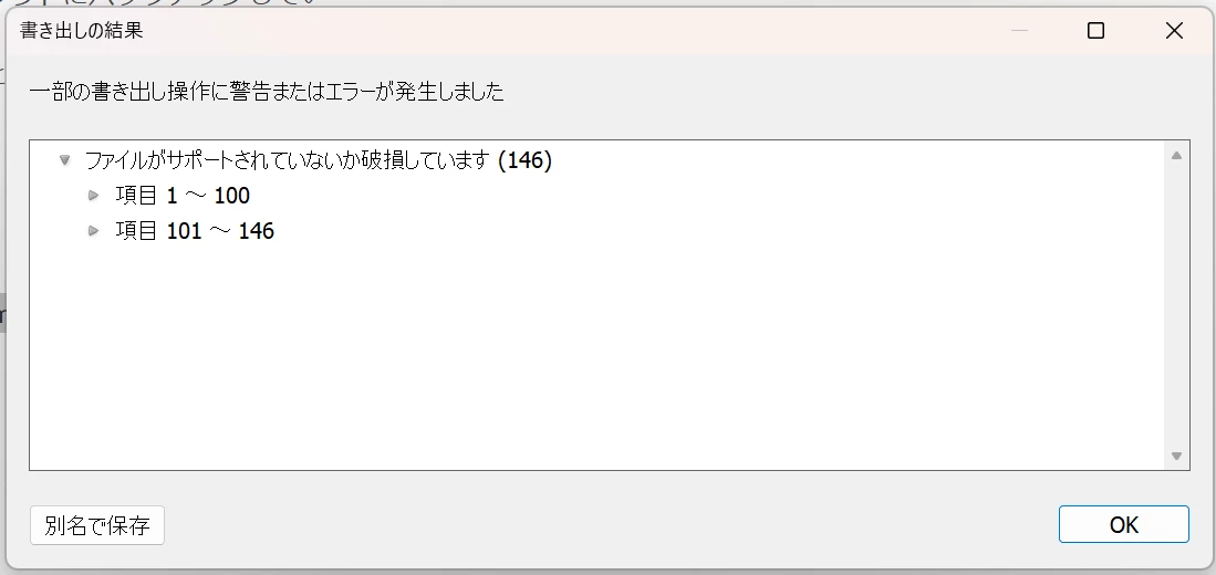 タイトル:一部の書き出し操作に警告またはエラーが発生しました