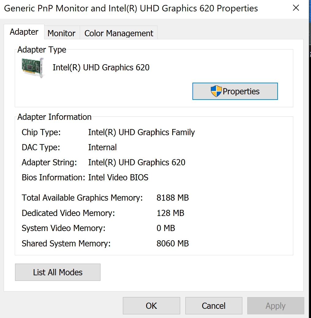 Graphics Processor Info: DirectX: Intel(R) UHD Graphics 620 (26.20.100.6813)