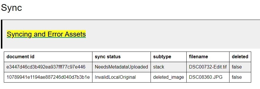 3. Search the document for "syncing and error assets" which will bring up two results, first the table of contents and second, the real thing. If there are any errors syncing, there will be a table showing all relevant info of the troublemakers, the most important ones being "filename" and maybe "sync status". It will look like this.