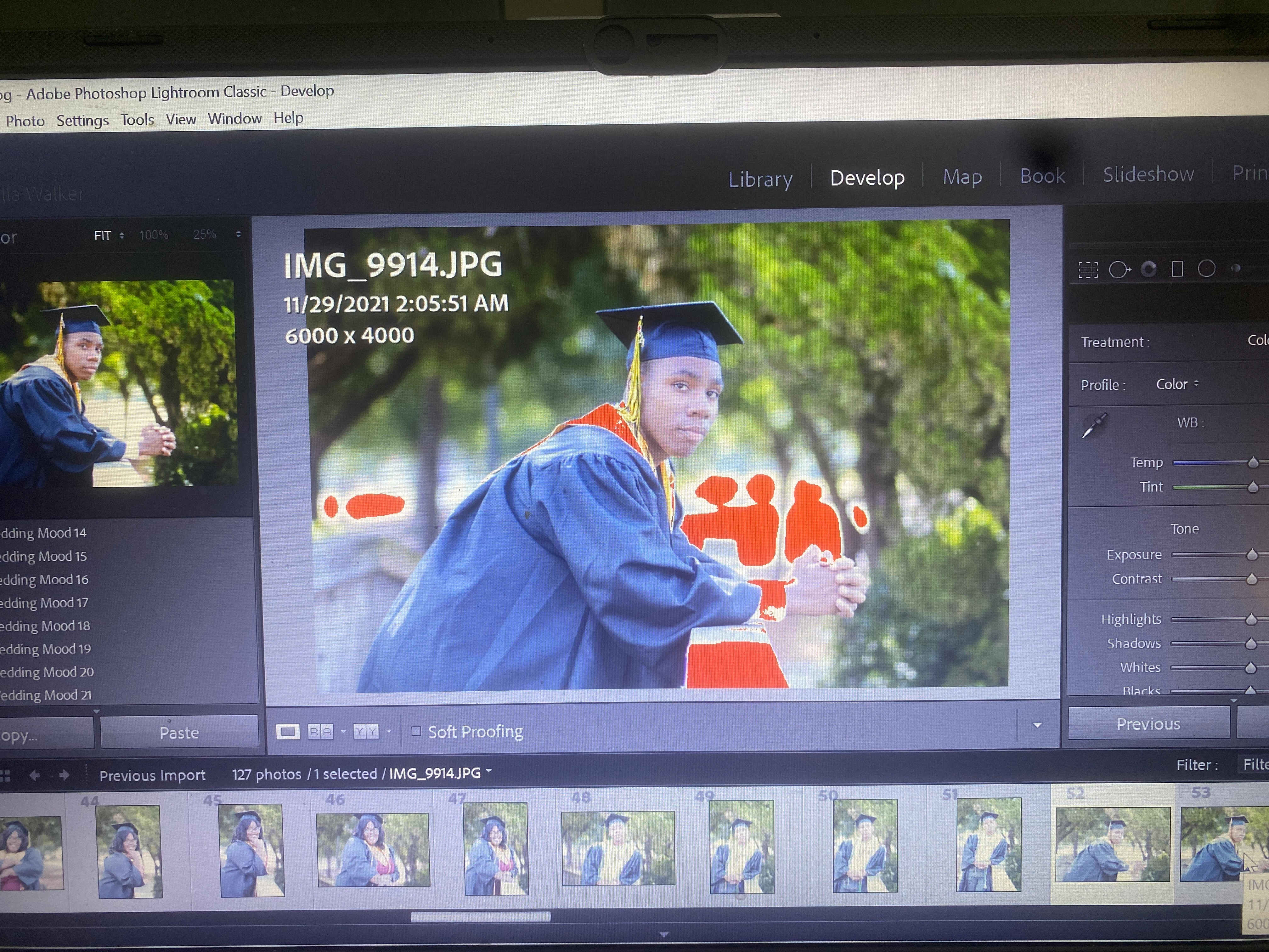 The red areas that you see in that image are areas that are overexposed in tthe white area and are clipped. The red is the clipping indicator that is built into Lightroom. There is also a blue clipping indicatoor to indicate shadows that are being clipped. These indicators can be turned off by pressing the J key. Alternatively, you can click on the little squares In the upper corners of the histogram to activate/deactivate the indicators individually.
