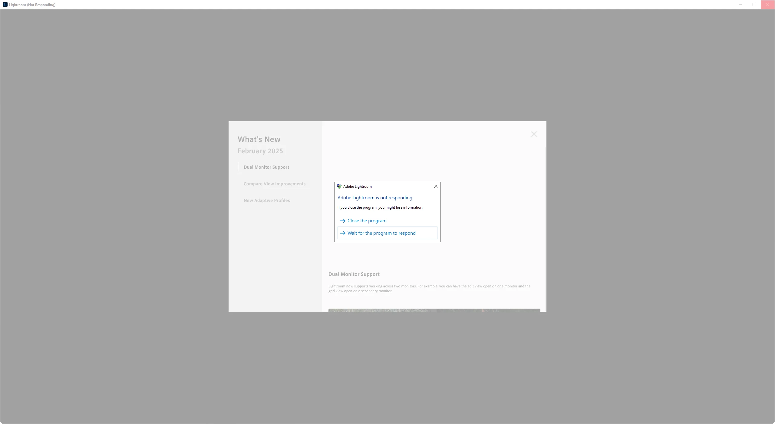 Lightroom Desktop freezes (then crashes) when the "What's New Feb 2025" window appears
