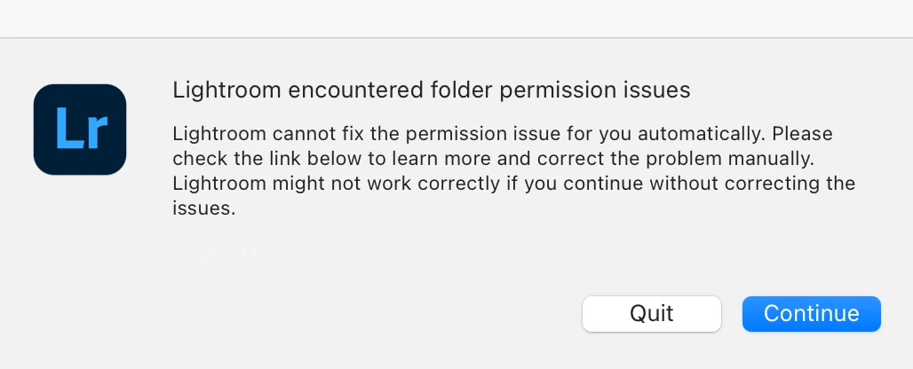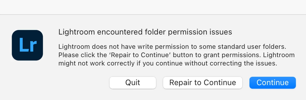 I just upgraded to Lightroom 7.3. When I open the app, I get the following error message: