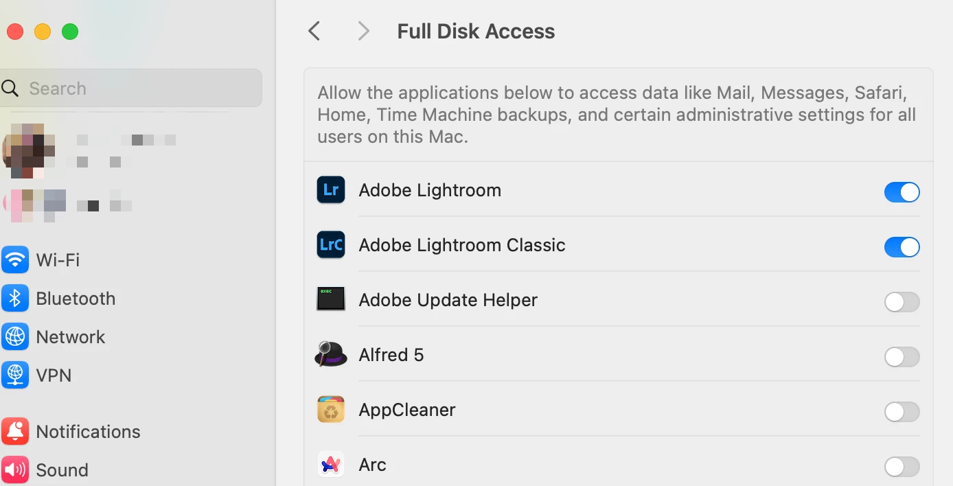 I have enabled Full Disk Access for both Lightroom CC and Lightroom Classic: