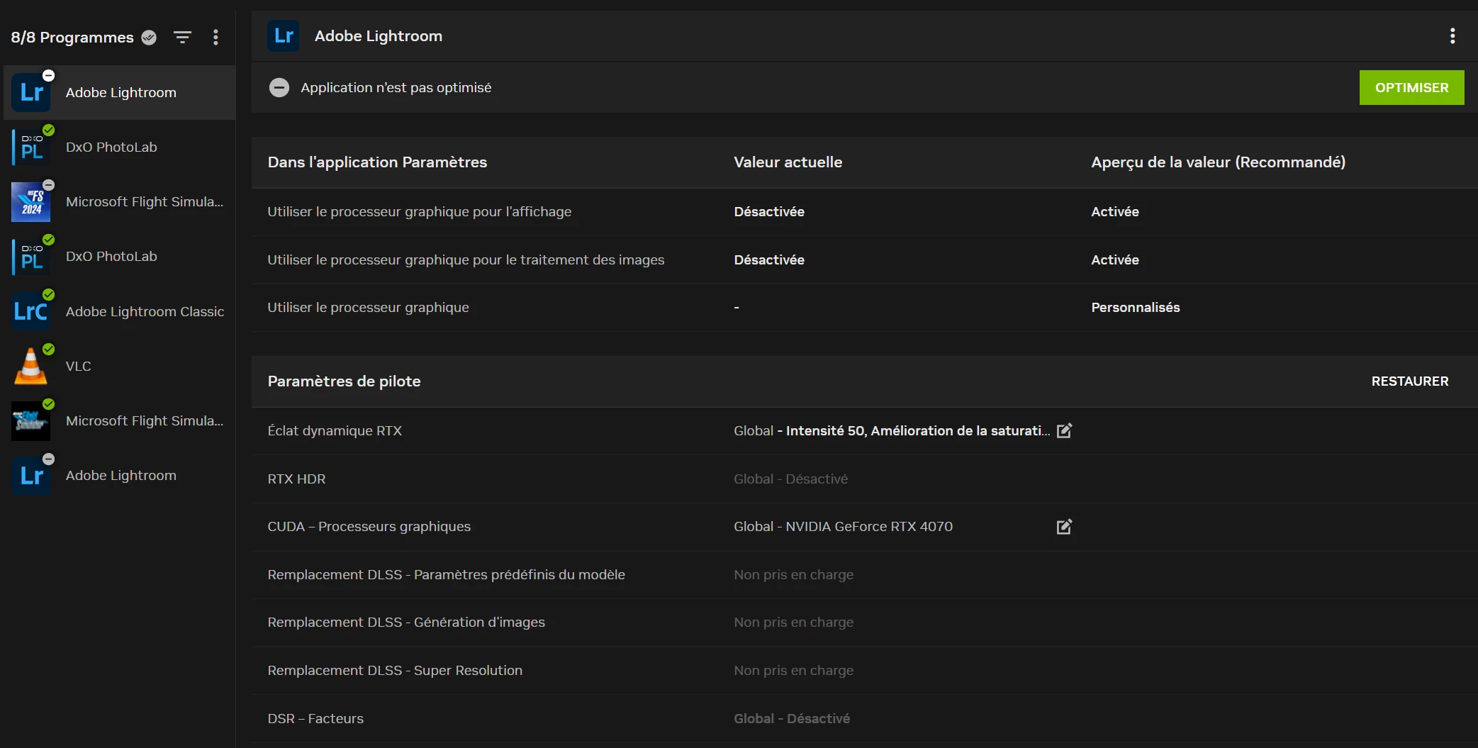Bonjour Lighroom et Photoshop ne sont pas reconnus par Nvidia RTX 4070 ce qui me genere enormement de probleme