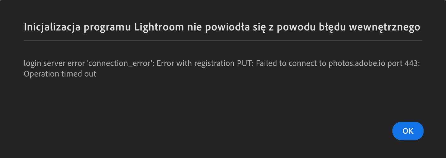 4. After some time out LR trying to connect to cloud it crashes with 'Lightroom initialization did not success because of an internal problem' (translation from Polish) and 443 Operation timed out.