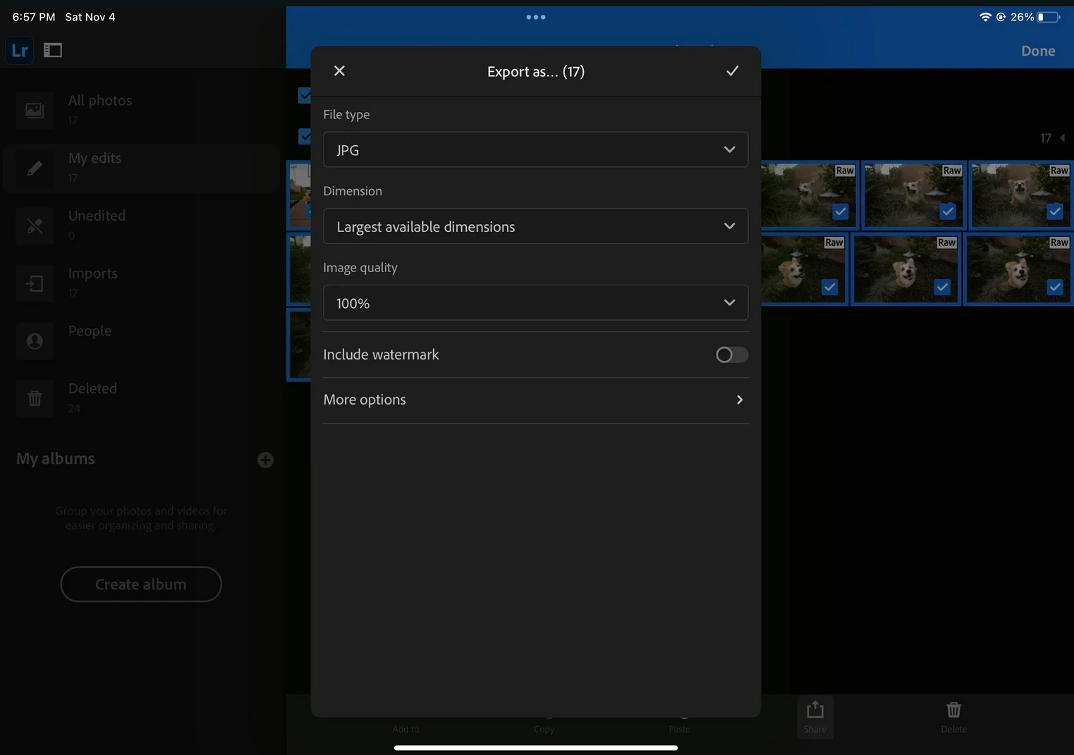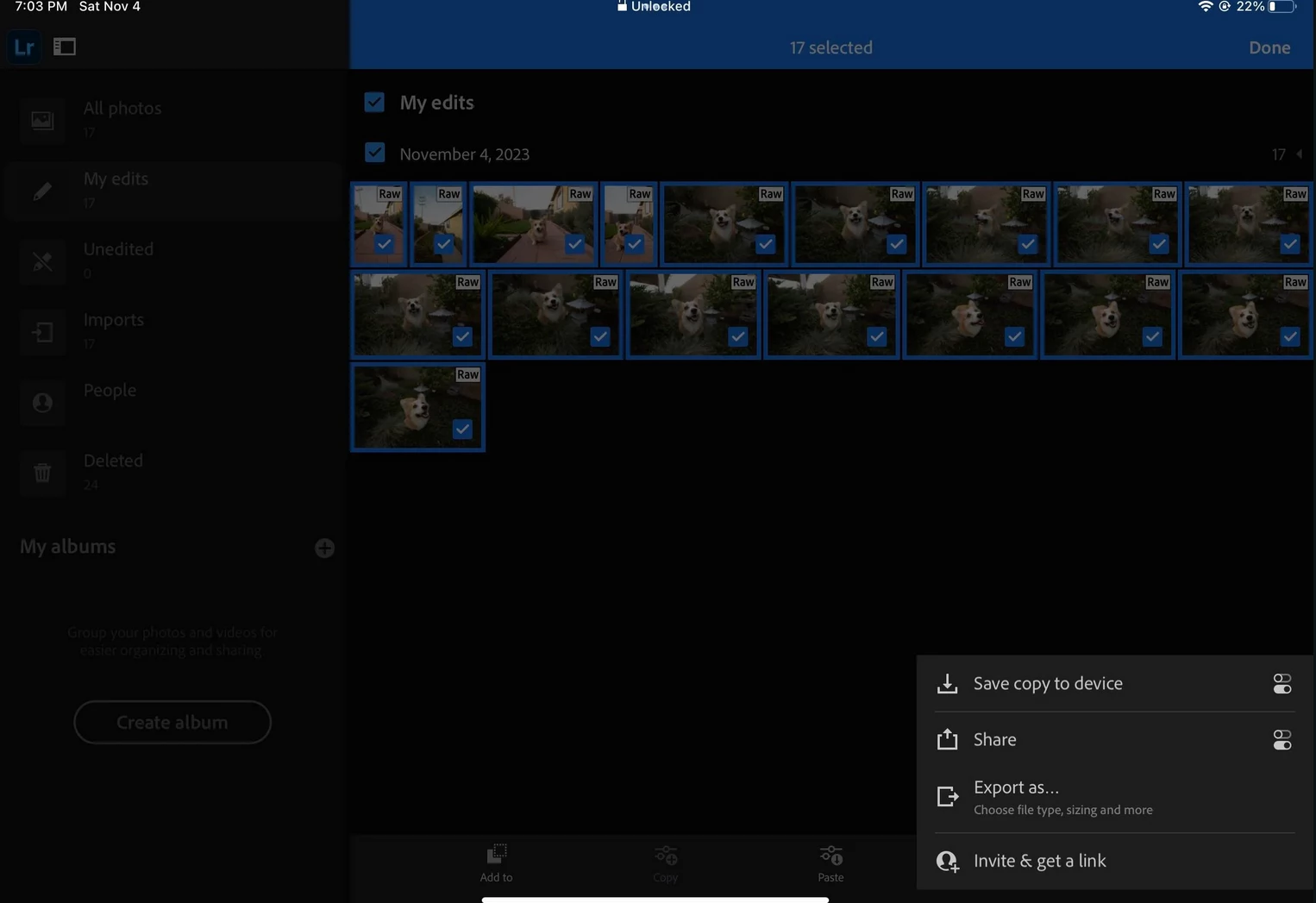 Second problem is, there is only a save copy to device. I remember distinctly when using this in the past there was a "Export to 'x" or 'y' " option, like to photos or to files, but that option no longer seems to be available. Even if I choose the export option, it doesn't even save the files anywhere. It exports it and then gives me an option to share it via other apps on my device. I'd like to be able to export and save it to an external drive/sd I connect but there is not option or ability to do that. Not sure why this setting or option is gone as multiple youtube videos show users having the option to do that in their older lightroom versions.