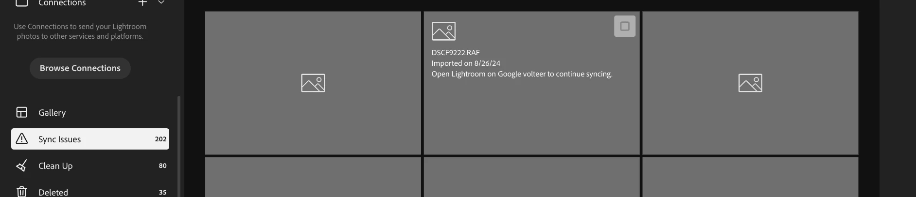 So now I think the main issue is there seem to be 202 photos from August that need to be synced. When I go onto to lightroom.adobe.com the message I get is as above. When I go into CB proper I can't see any way of dealing with it. In the past I have seen message Syncing 202 photos but even after hours nothing at all happens.